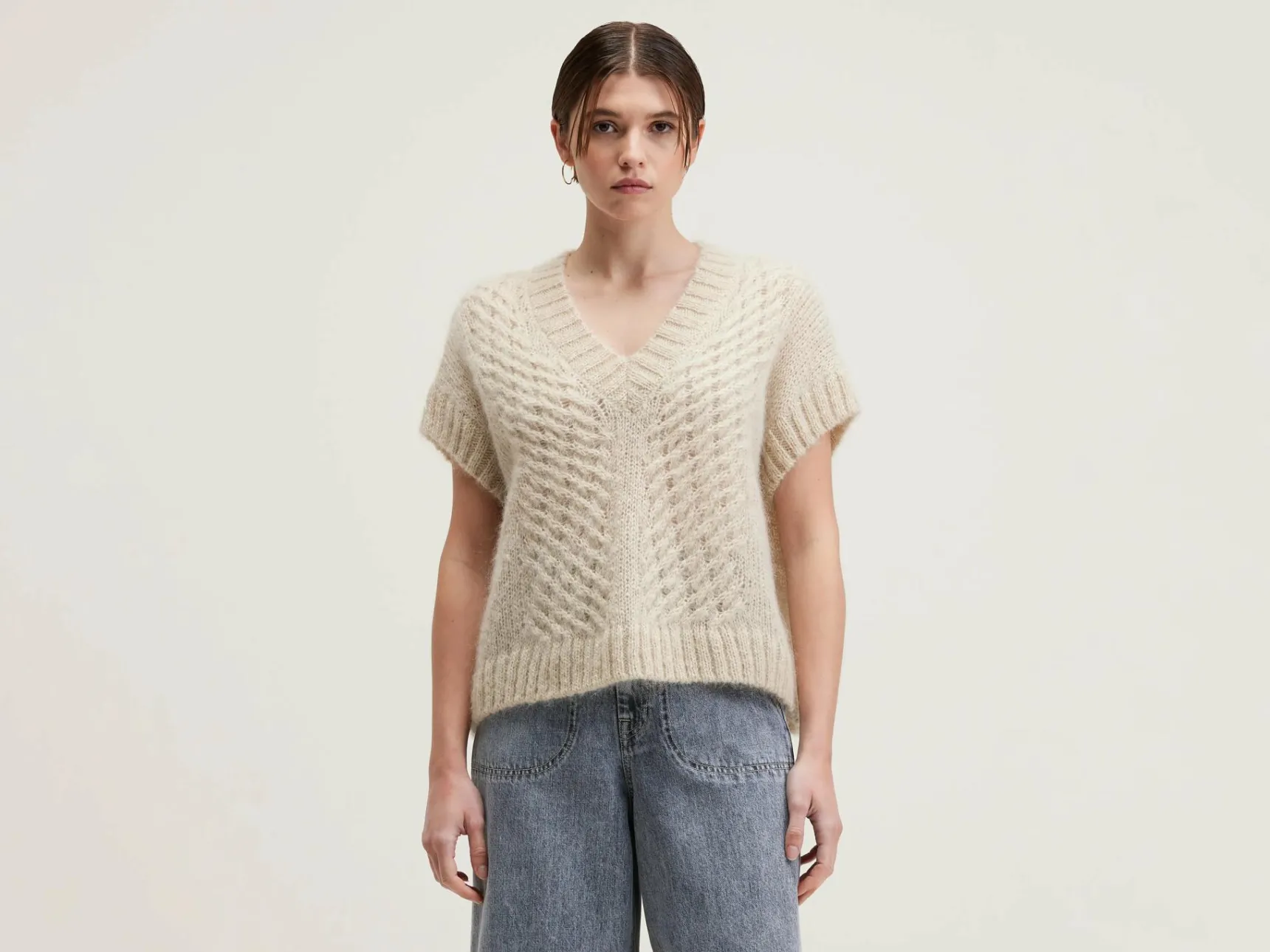 Lichte, oversizede, zandkleurige jumper zonder mouwen, met kabeldetails.