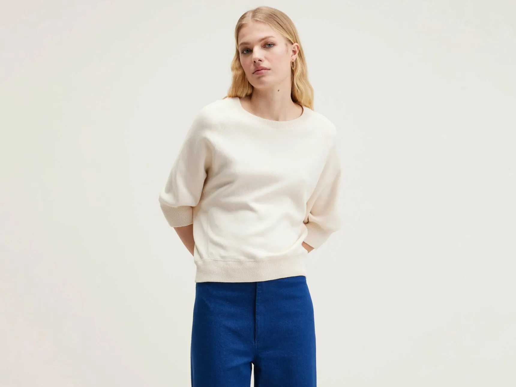 Oversizede crewneck trui met 3/4 mouwen en geribde boorden in ecru katoen.