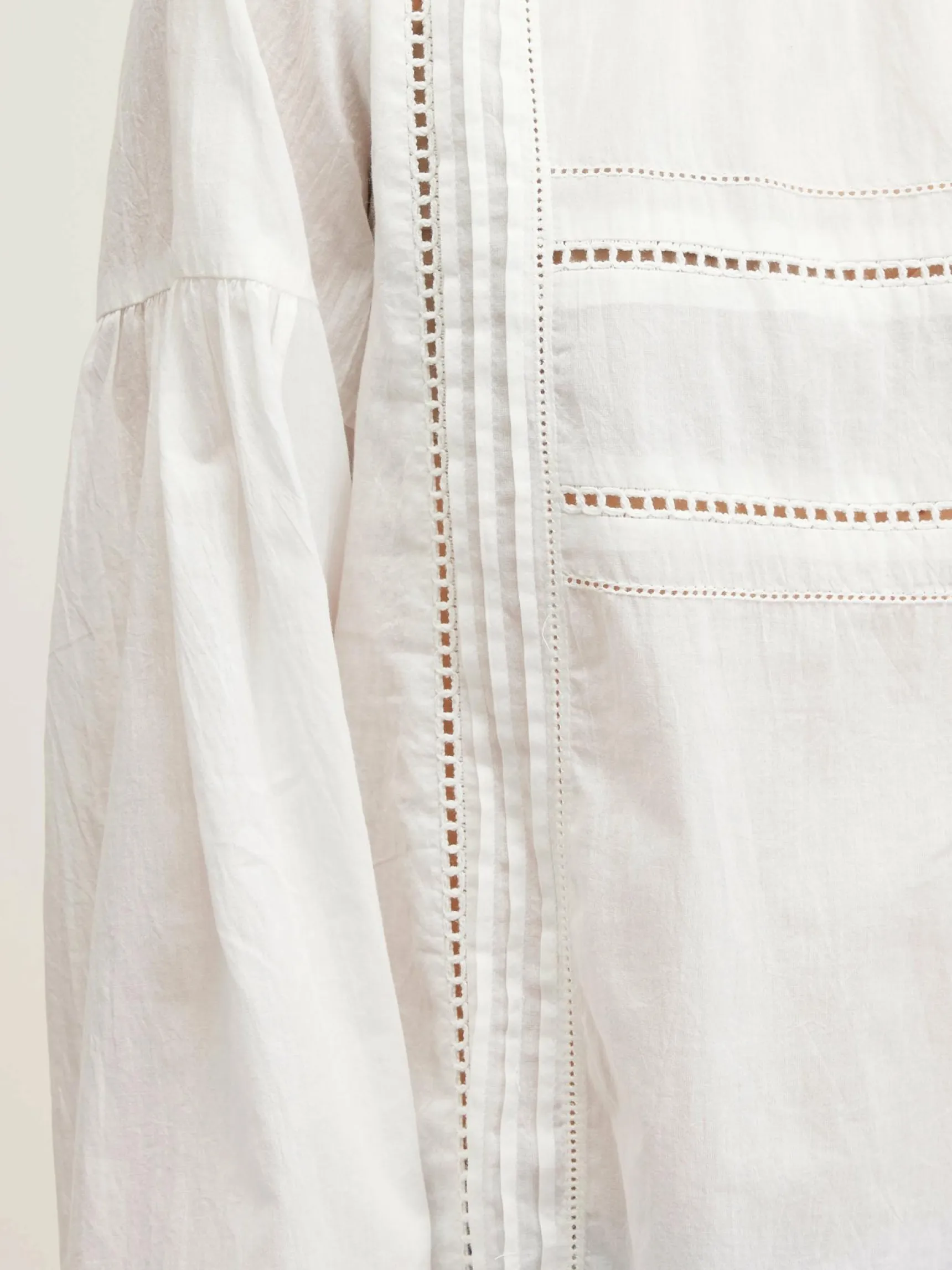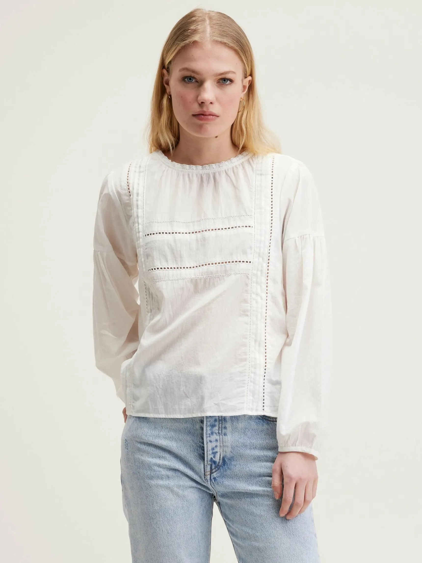 Romantische, natuurlijk witte blouse van katoen voile, met gefronste plooien en details van kant.