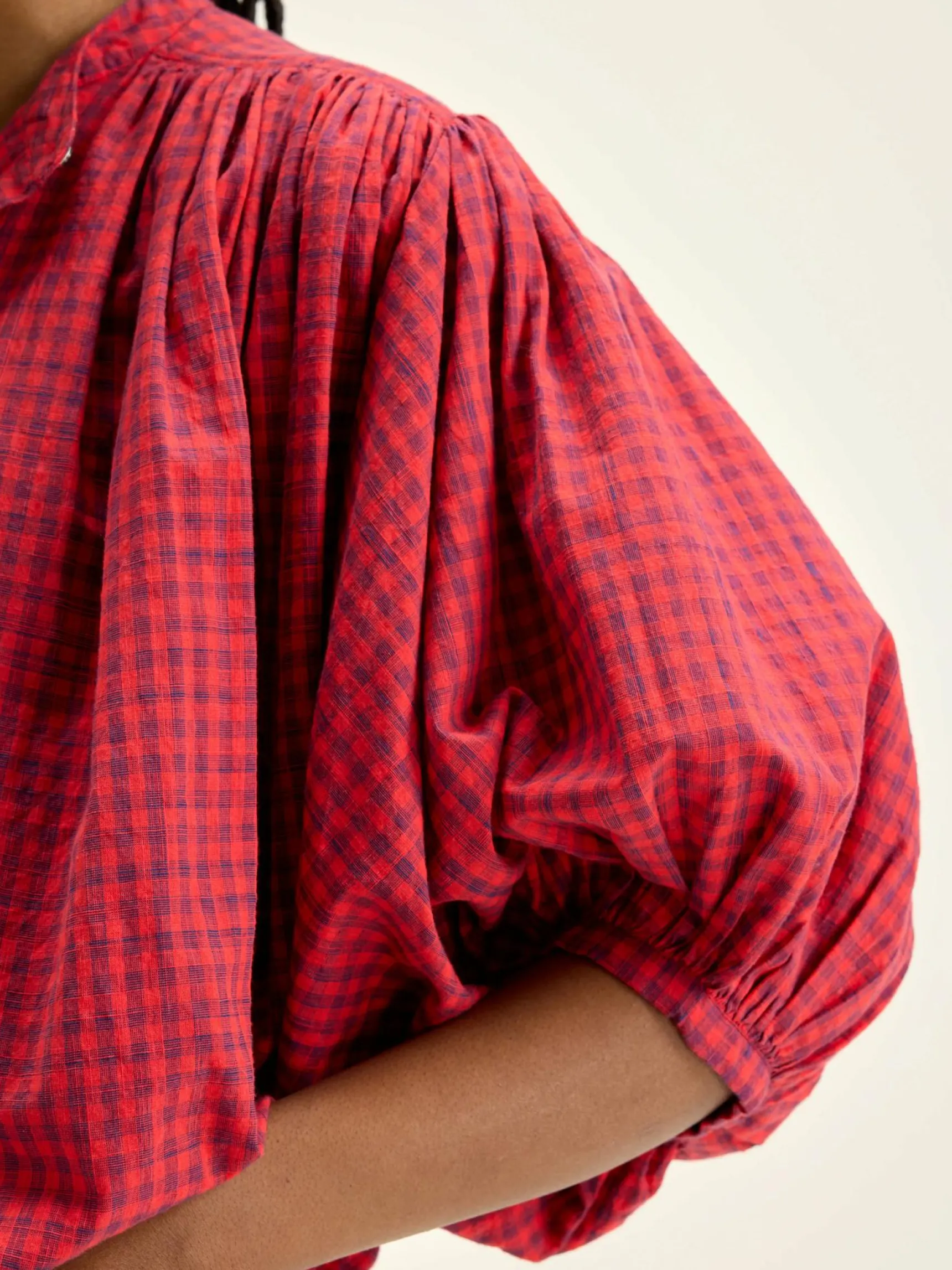 Oversizede blouse van getextureerd, rood en blauw ginghamkatoen, met gefronste details.
