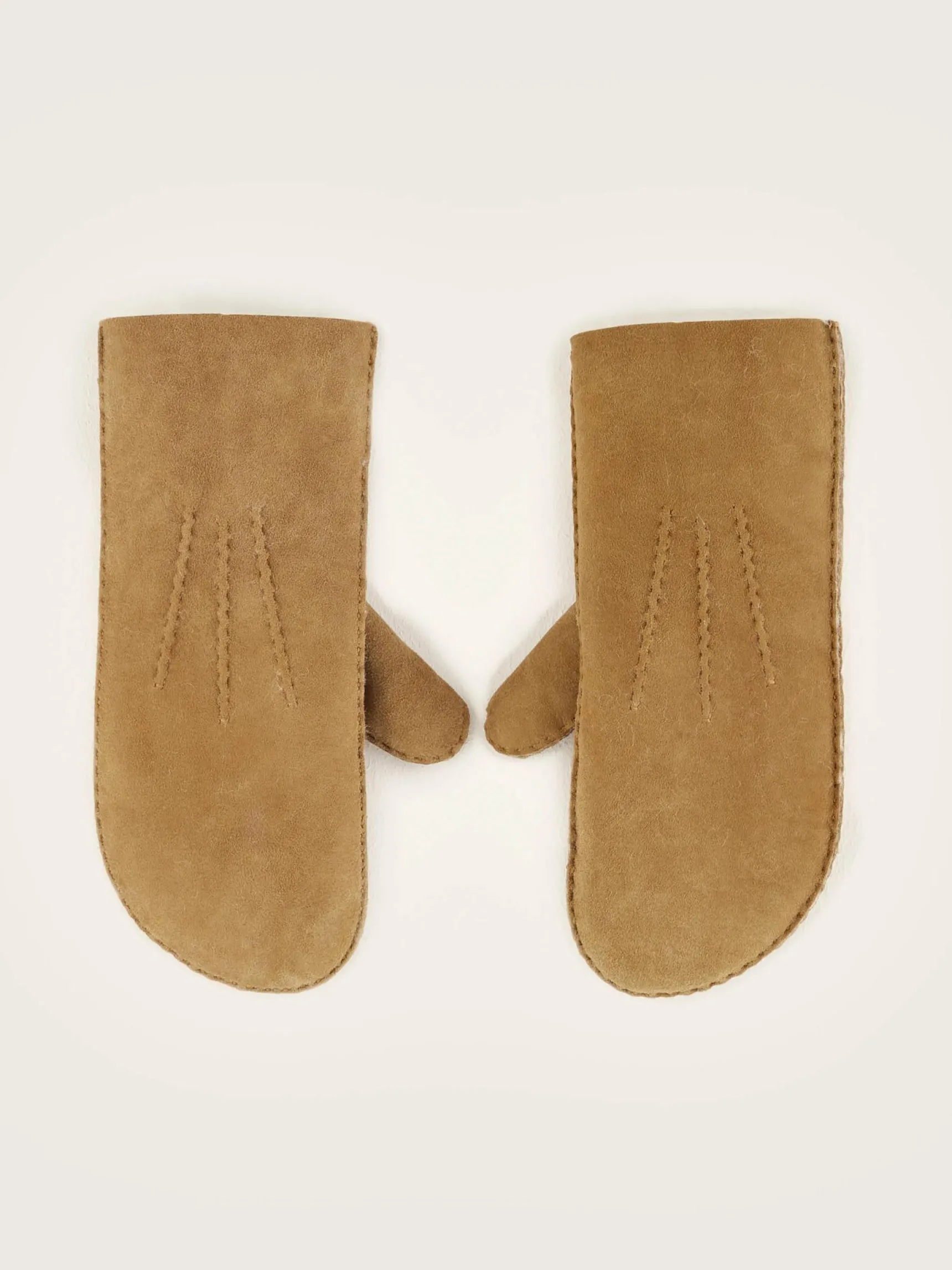 Klassieke wanten van cognac-kleurige shearling, met de leren kant vanbuiten en de wollige kant naar binnen gekeerd.