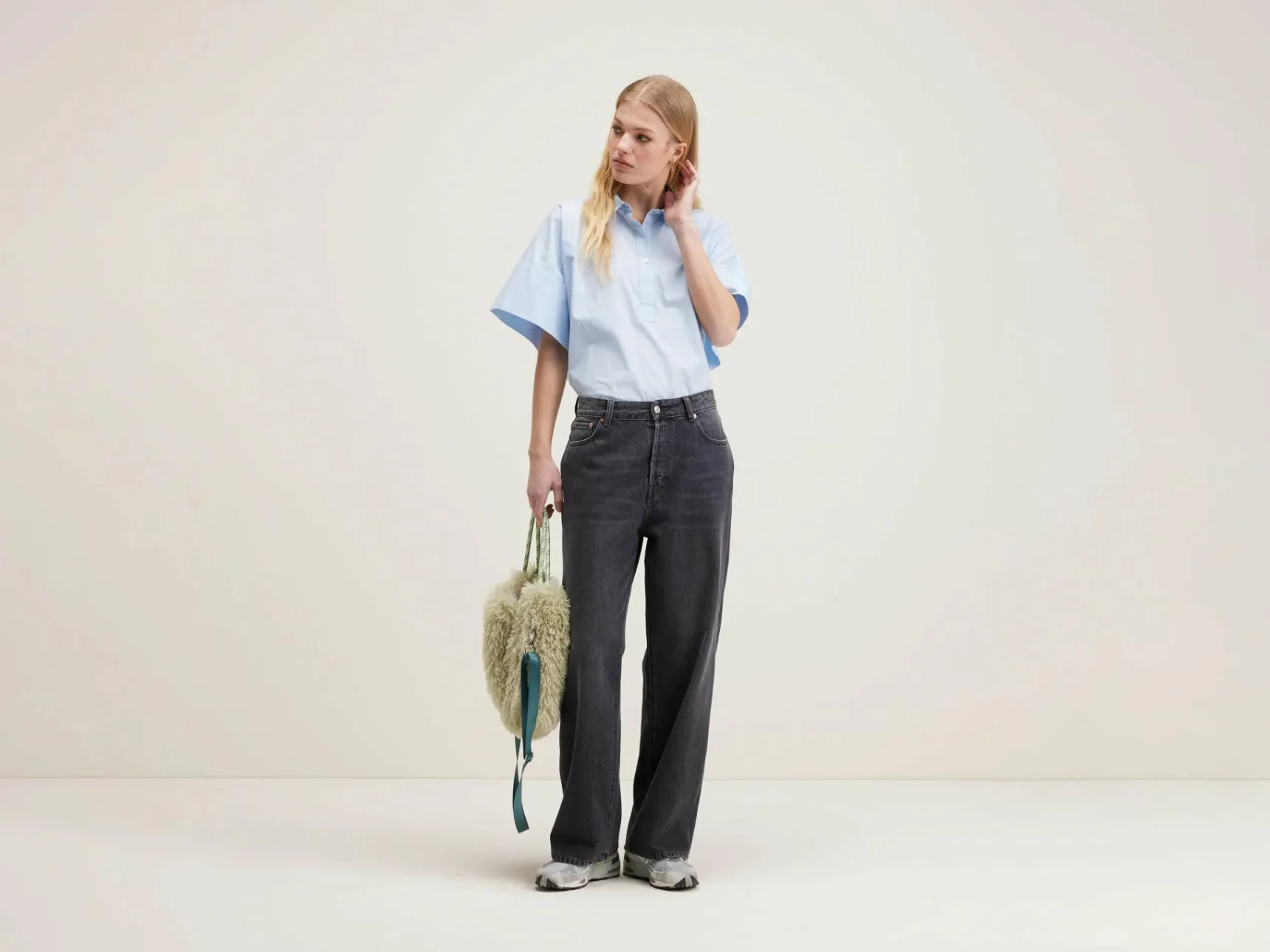 Mid-waist jeans met wijde pijpen in versleten zwart.