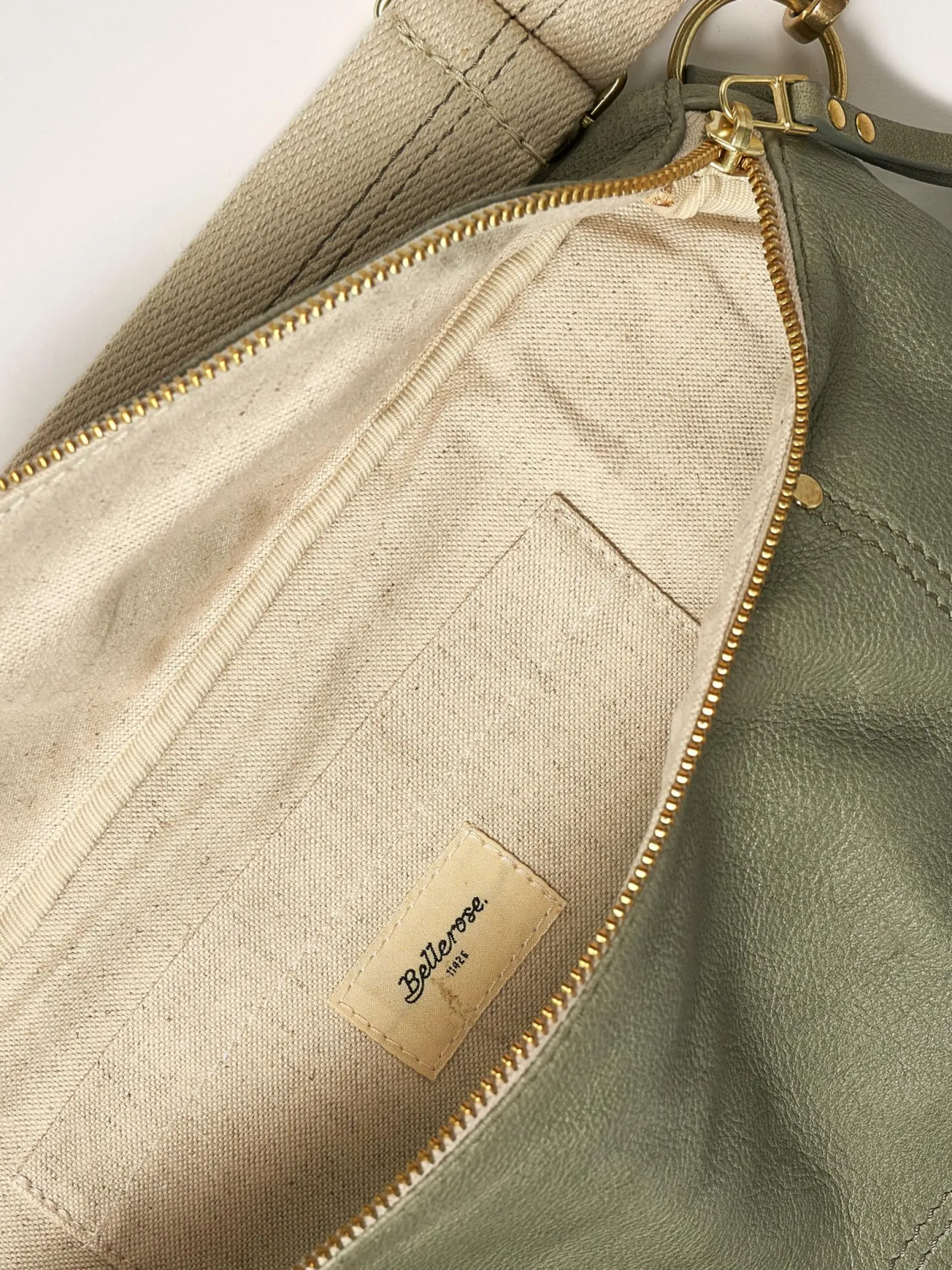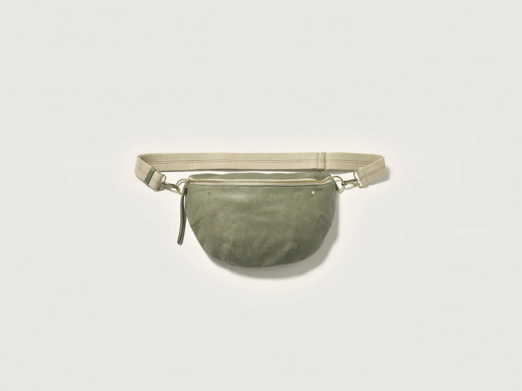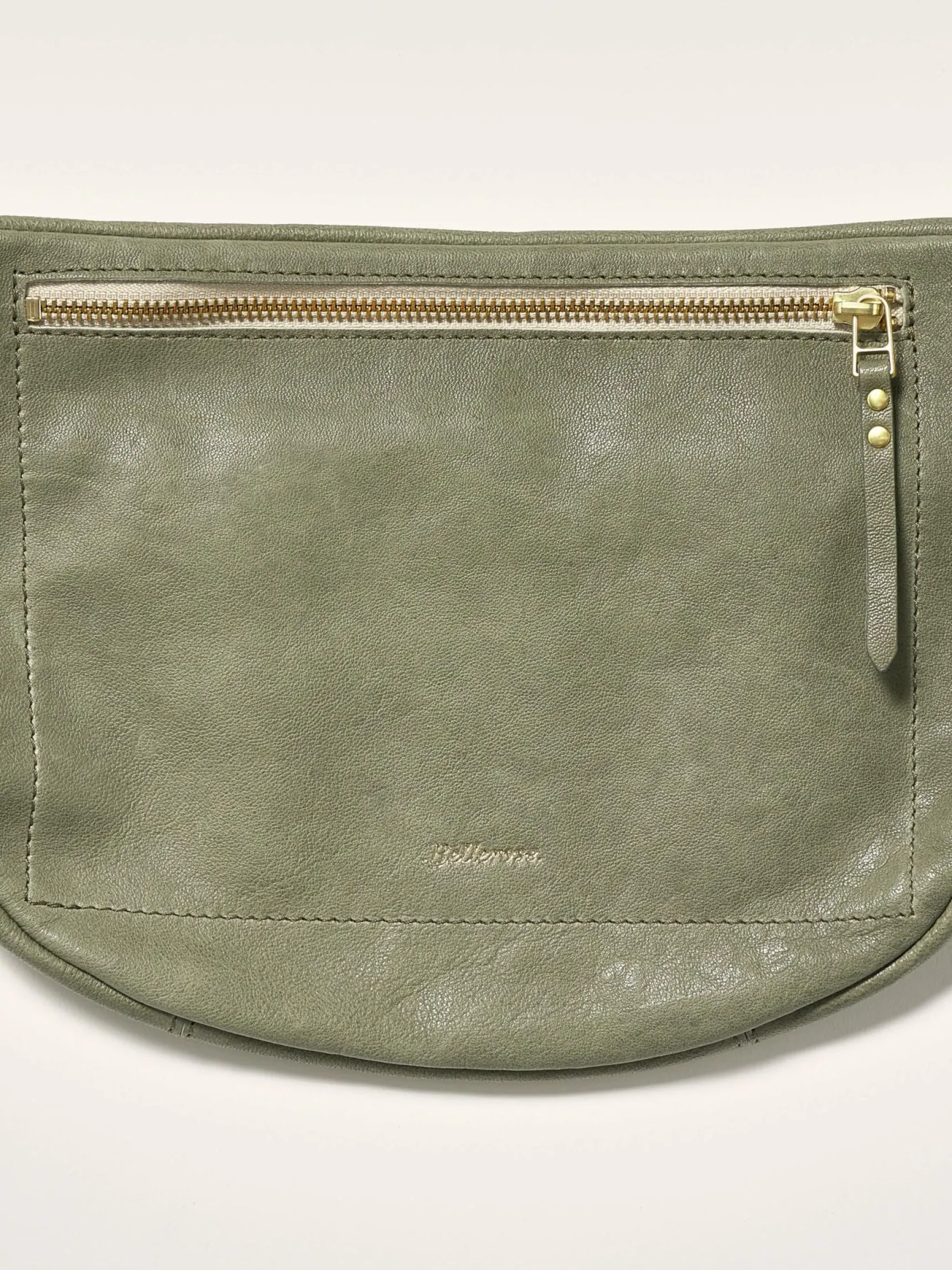 Soepele heuptas van grijsgroen leer.