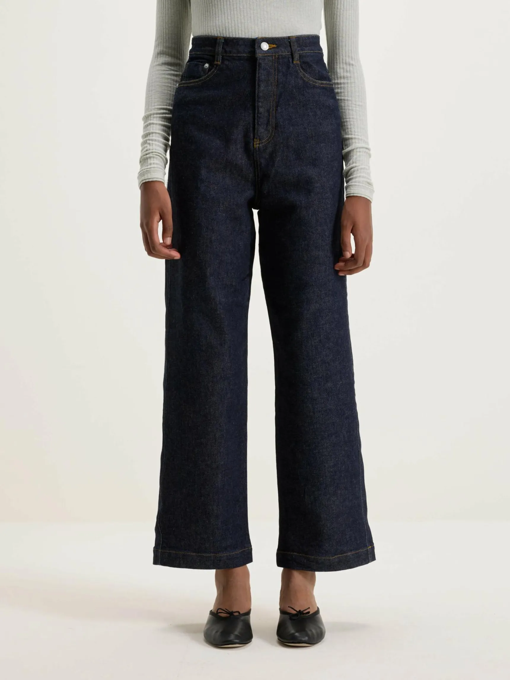 De Sophia Japanese Denim van het Japanse luxemerk Nicholson & Nicholson heeft een wijd, flared silhouet.