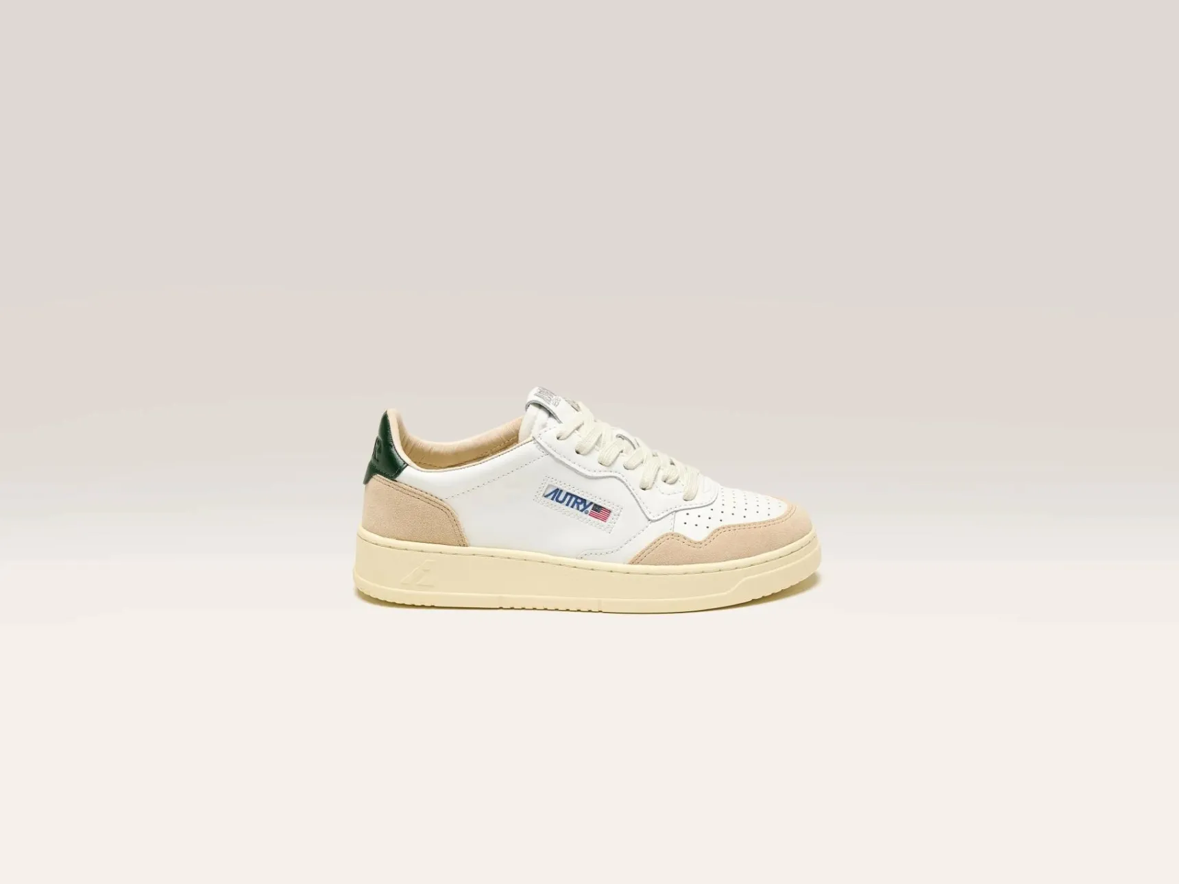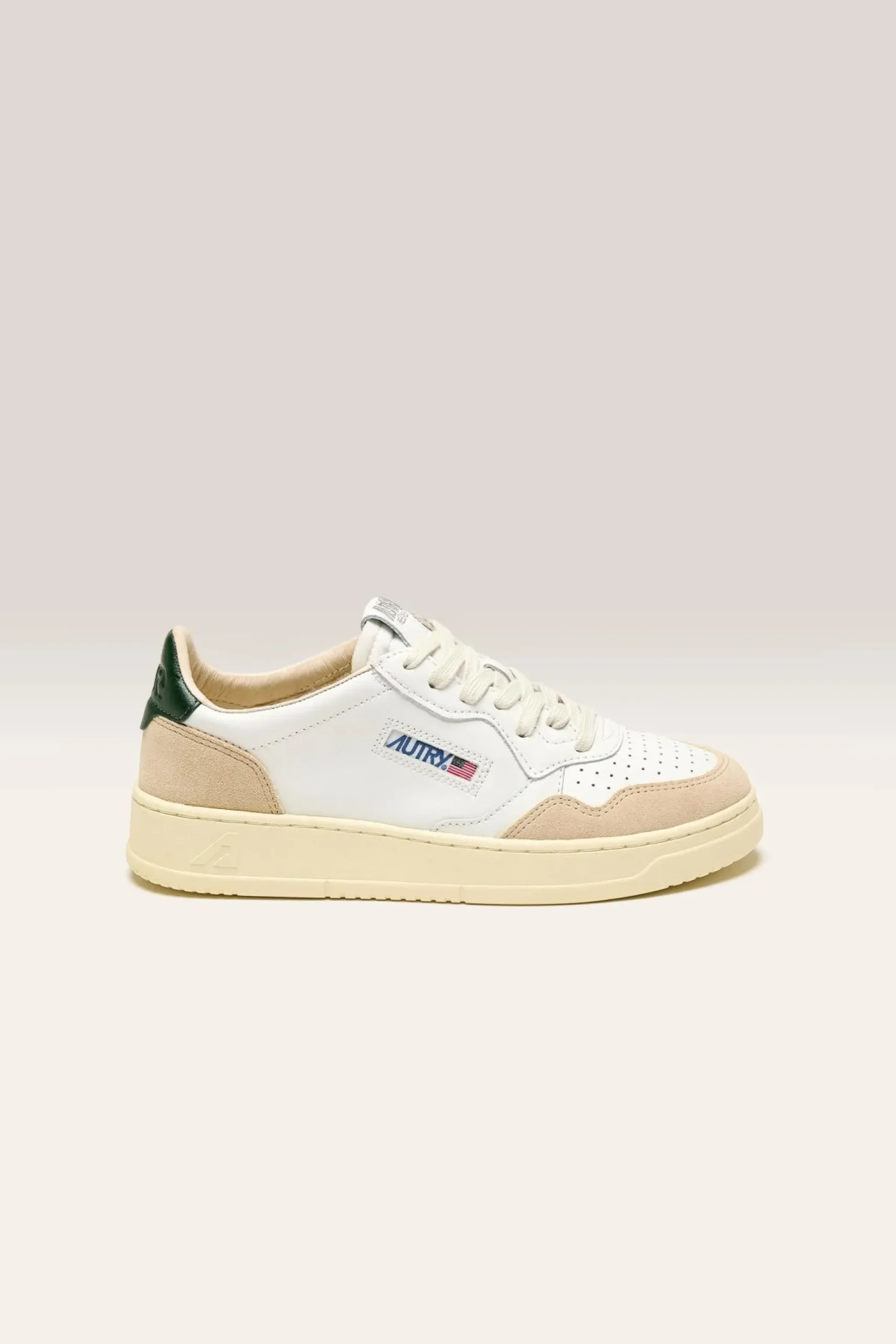 The Autry Medalist Low sneaker features a supple white leather upper, soft suede panels, and a perforated toe.