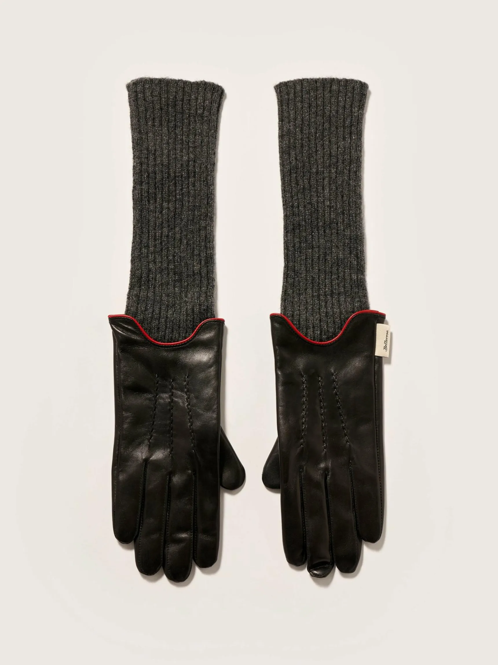 Zwartleren handschoen met grijze ribgebreide polsen.