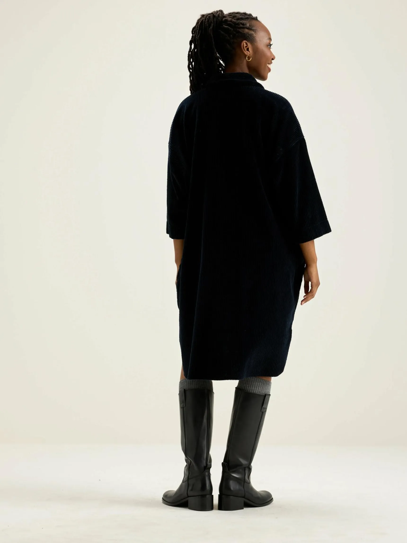 Donkerblauwe, oversizede hemdjurk van katoencorduroy met brede rib.
