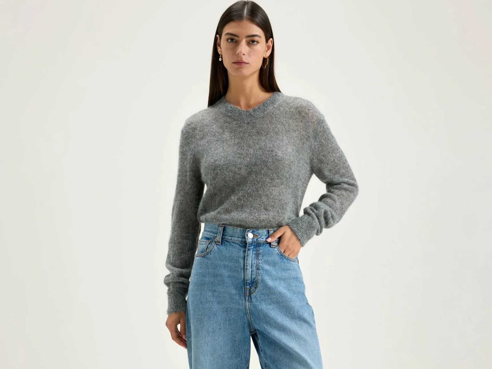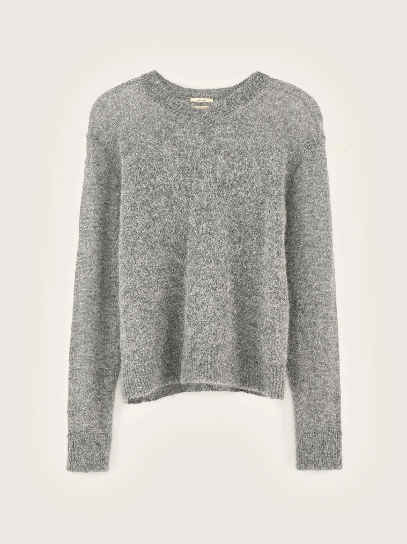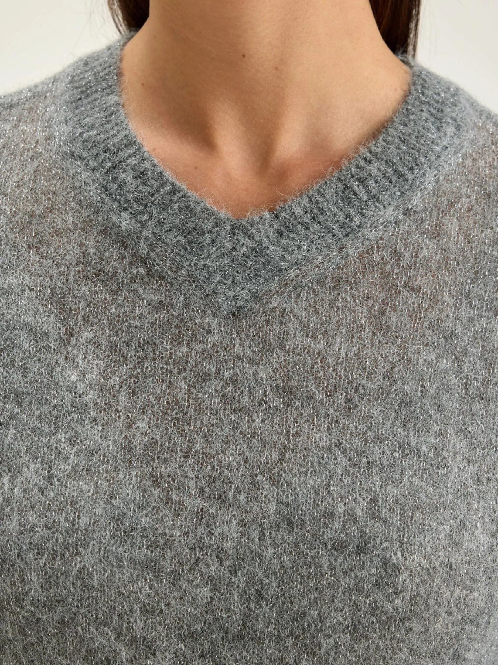 Middengrijze trui met V-hals en een regular model, van garen met lurex en baby alpaca.
