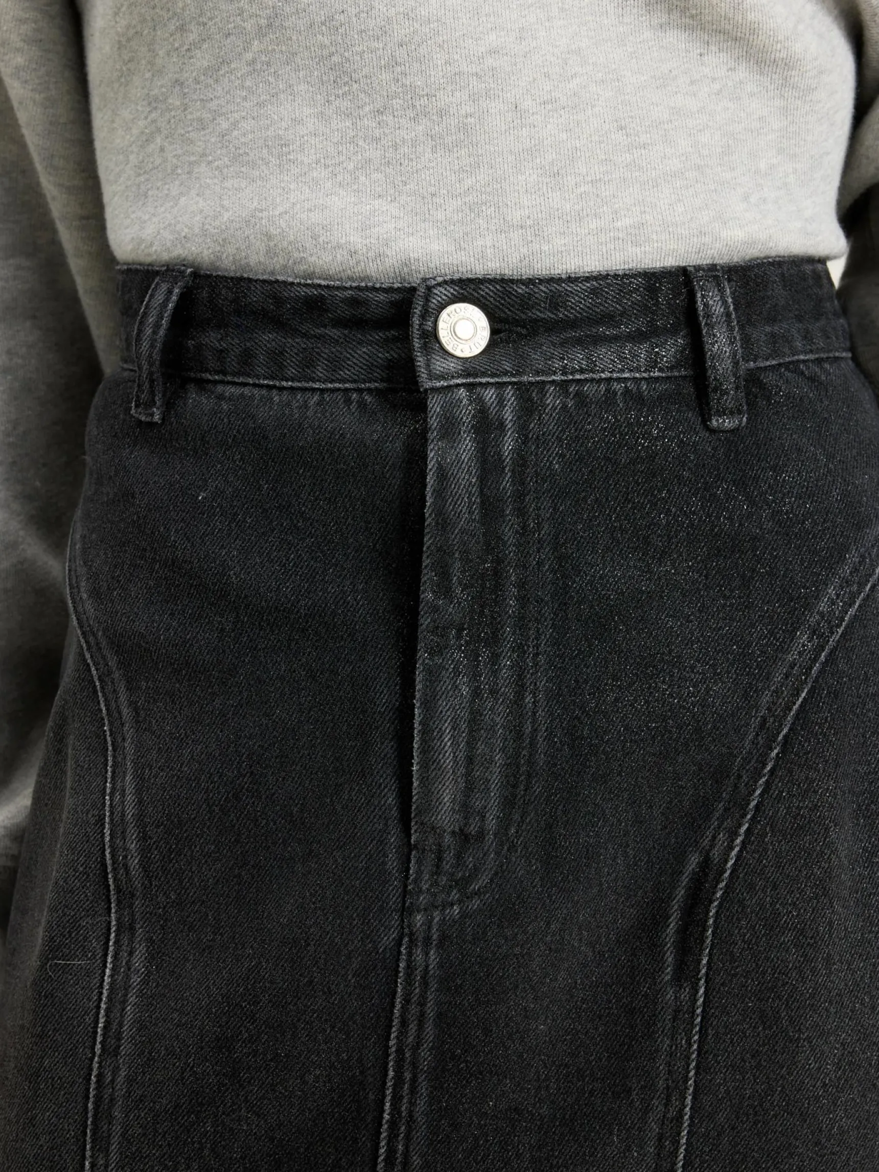 High-waist midikokerrok met gebogen panelen aan de zijkant, gemaakt van licht versleten zwart denim met een glanzend gecoate afwerking.