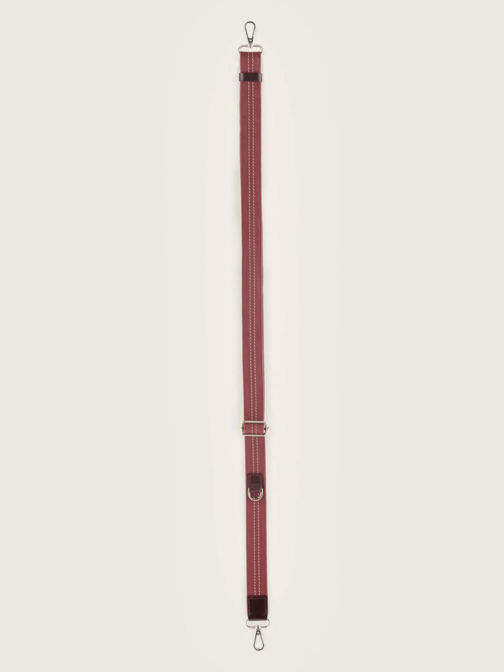 Verstelbare riem van bordeauxrood glad leer met zilverkleurige hardware.