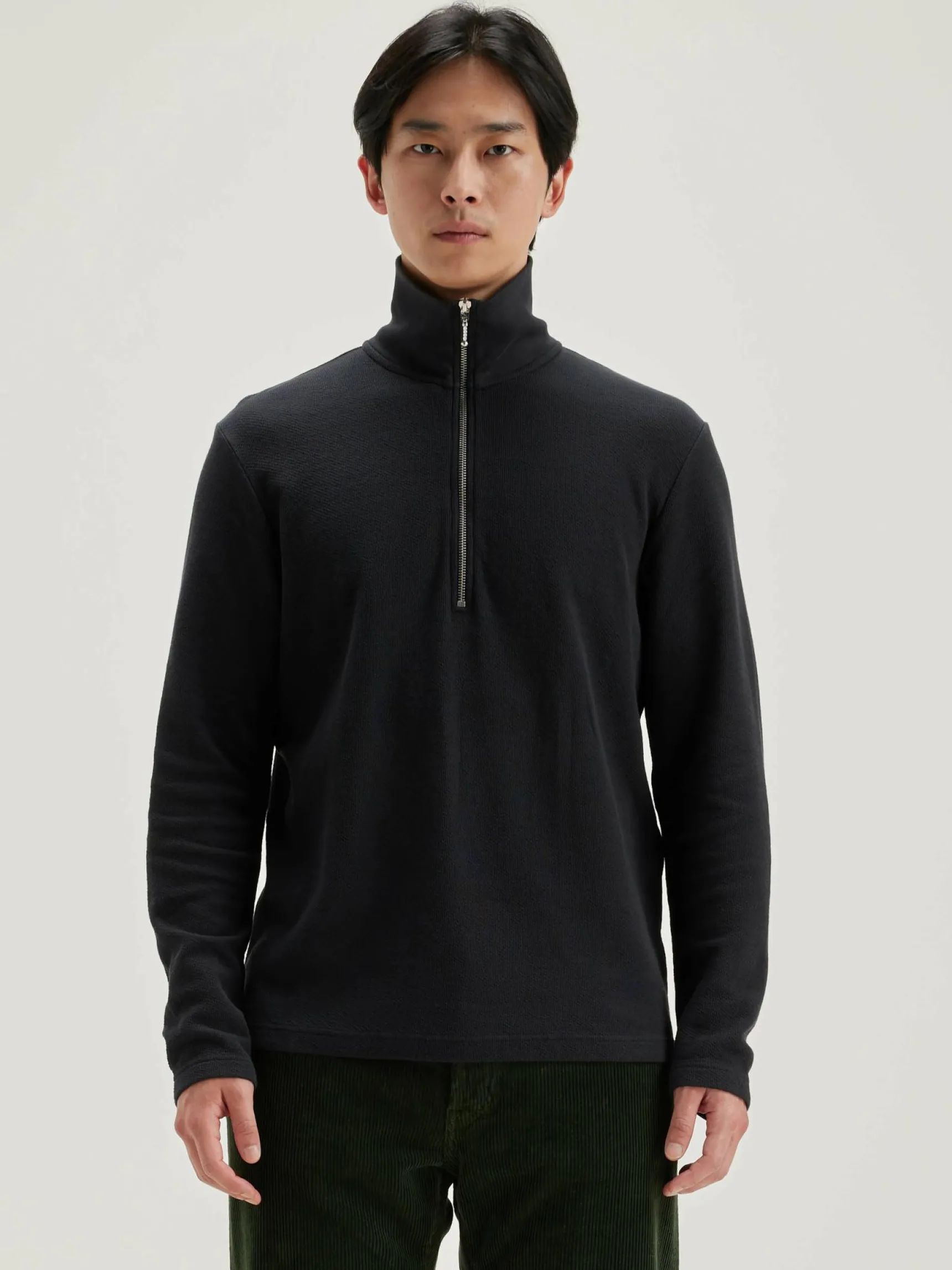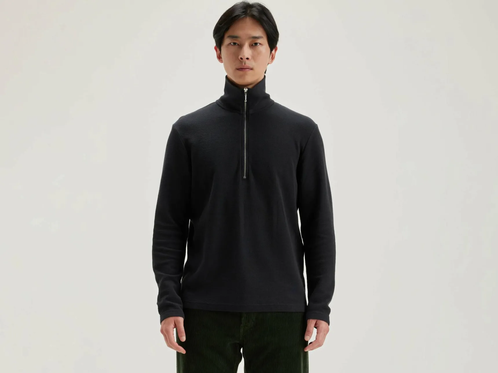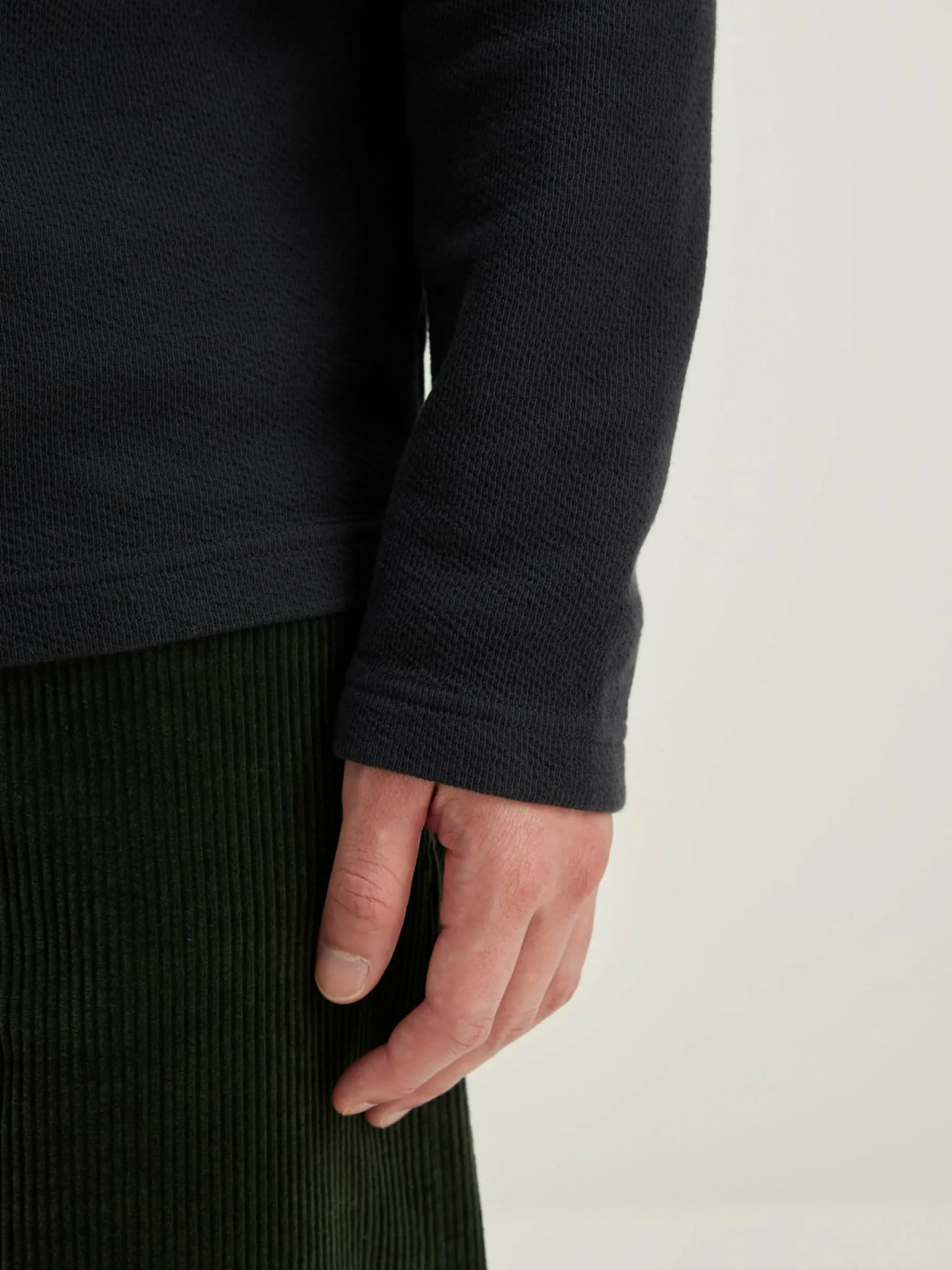 Klassiek marineblauw T-shirt met lange mouwen en een hals met ritssluiting, van dubbelzijdige katoenjersey.