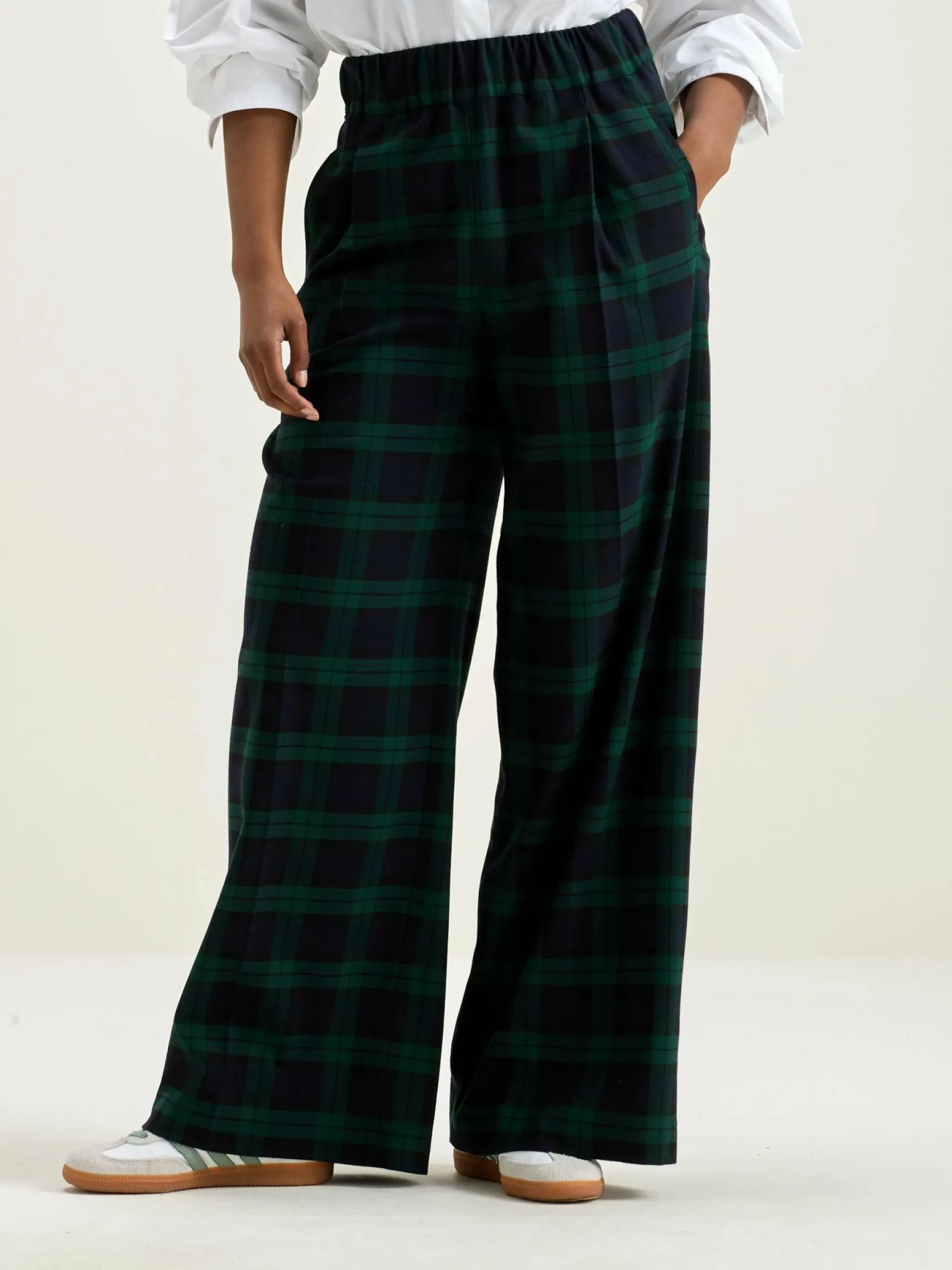 Broek met wijde pijpen, een elastische tailleband en paspelzakken, met black watch ruiten.