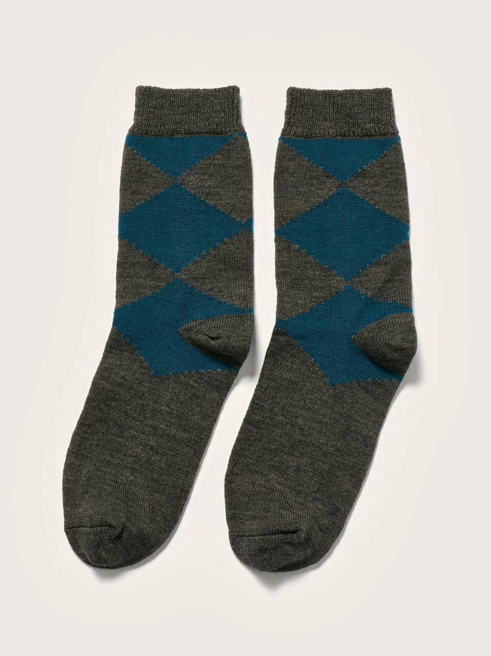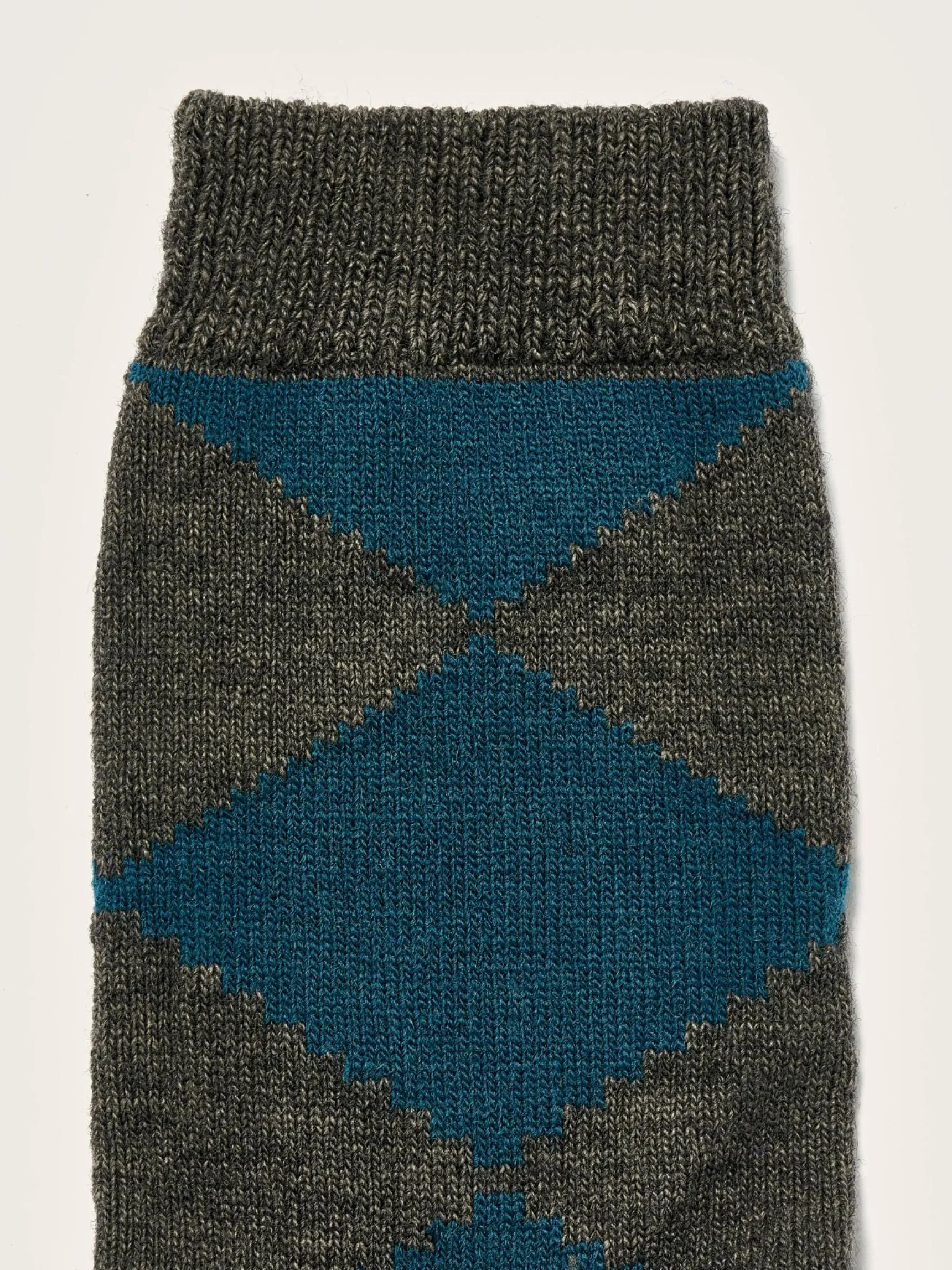 Klassieke, middengrijze sokken met een diamantpatroon.