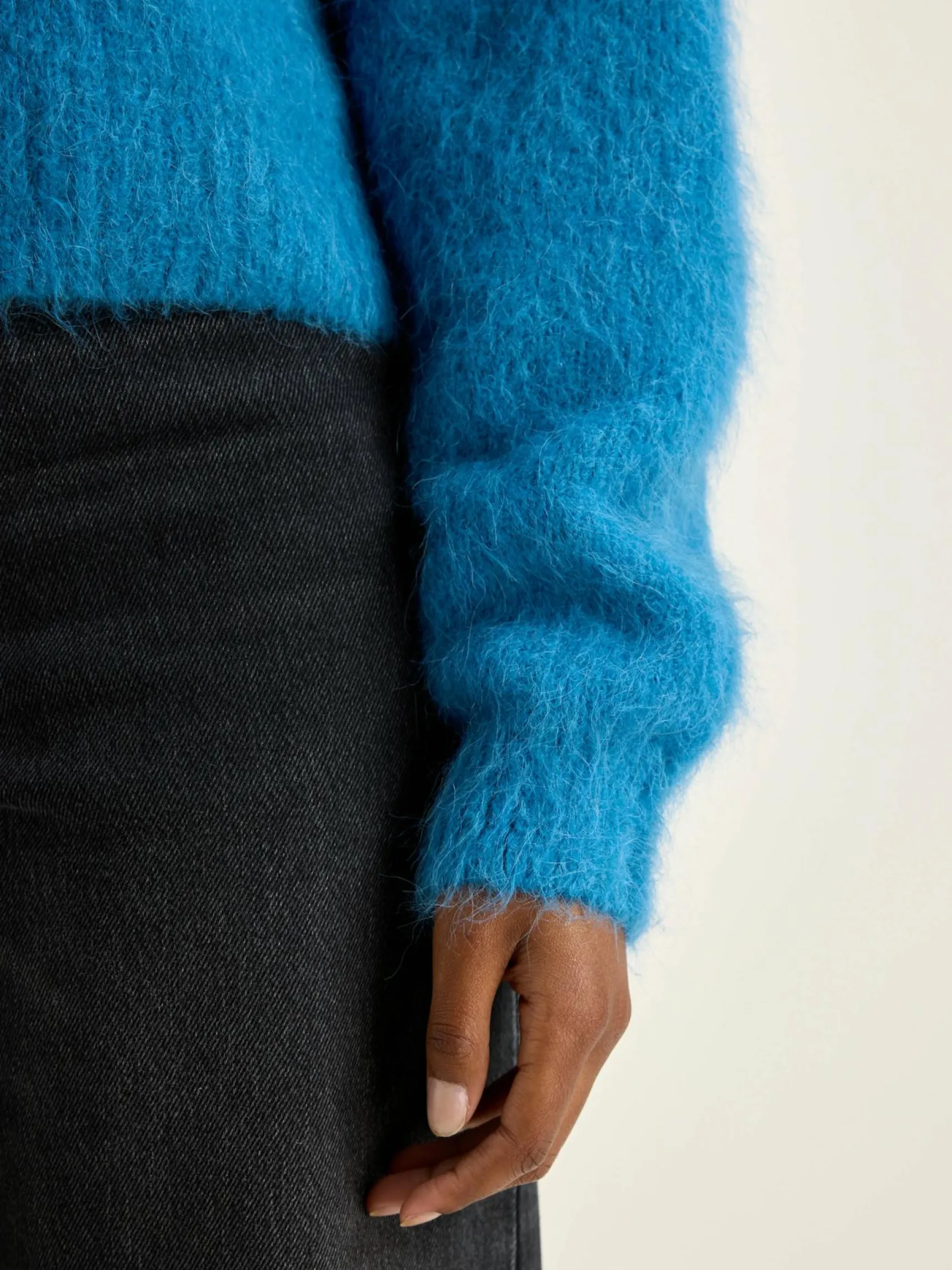Blauwe cropped trui met V-hals.