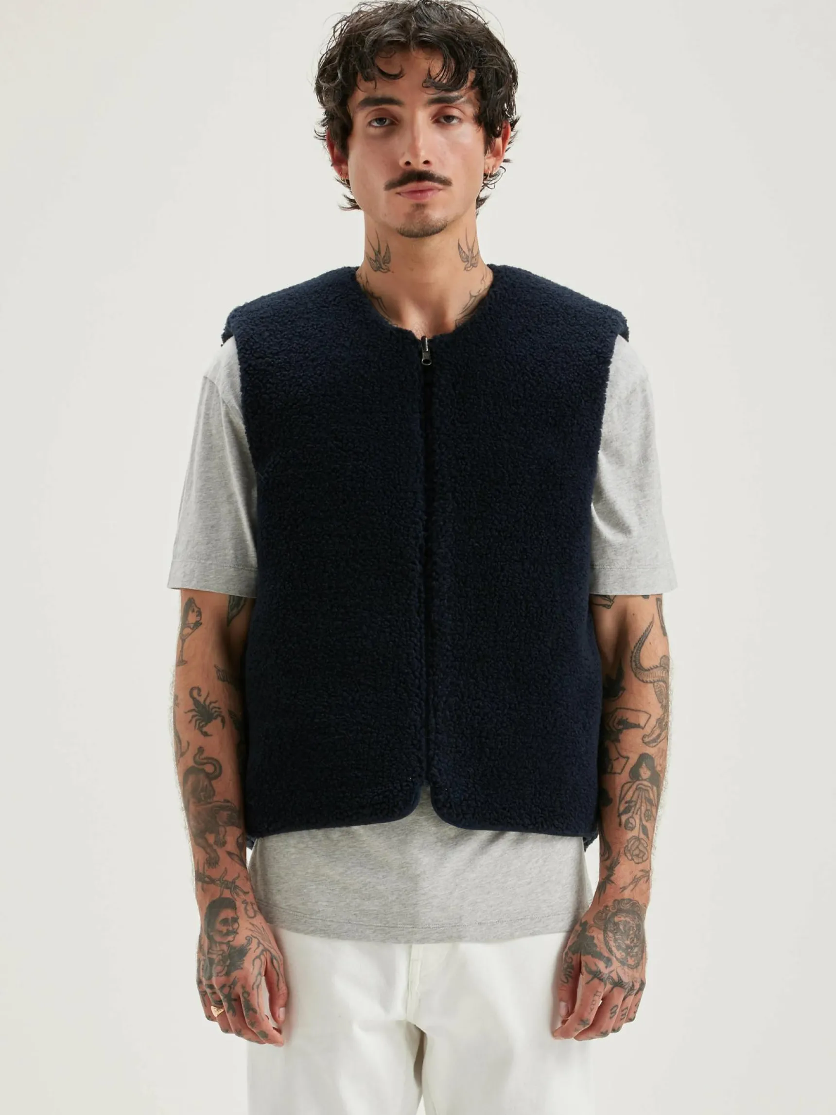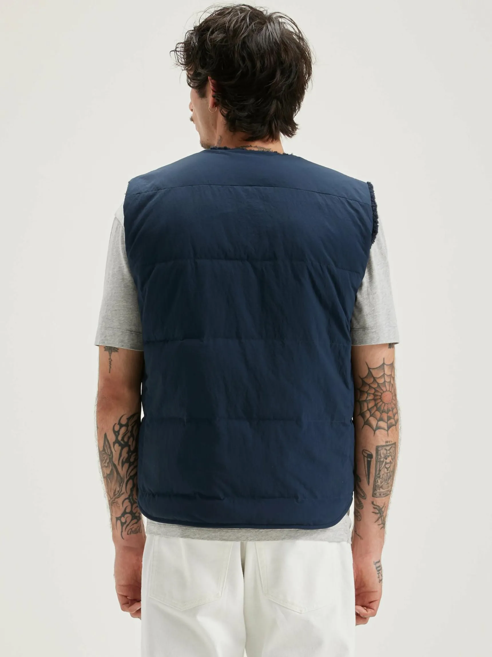 Omkeerbare, donkerblauwe bodywarmer van polyester, met een teddyvoering en ritssluiting vooraan.
