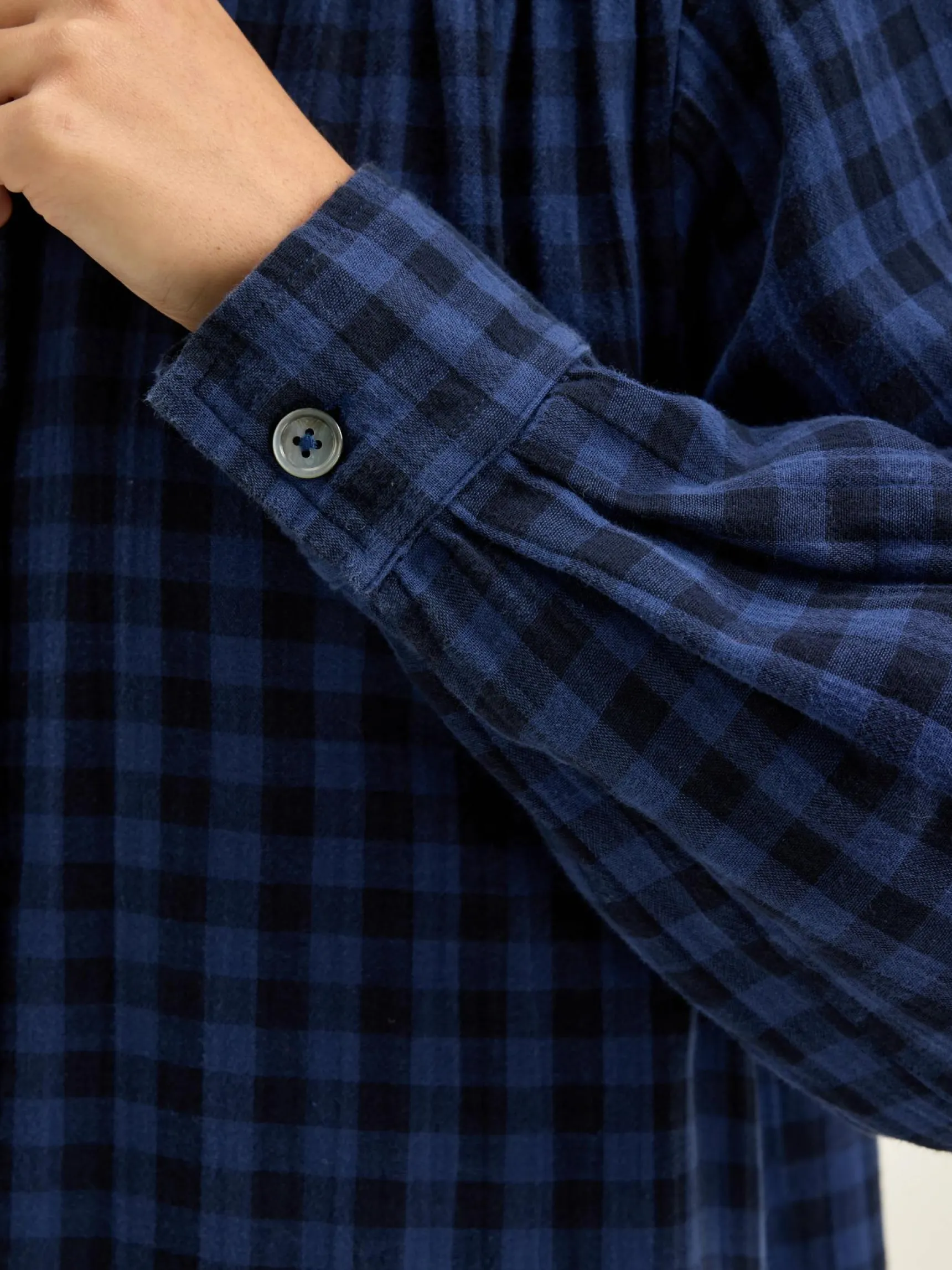 Mini-jurk in hemdstijl, met gefronste details en blauwe ruiten, van katoenen tetrastof.