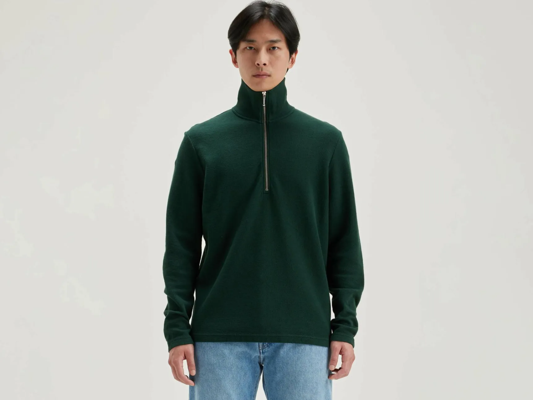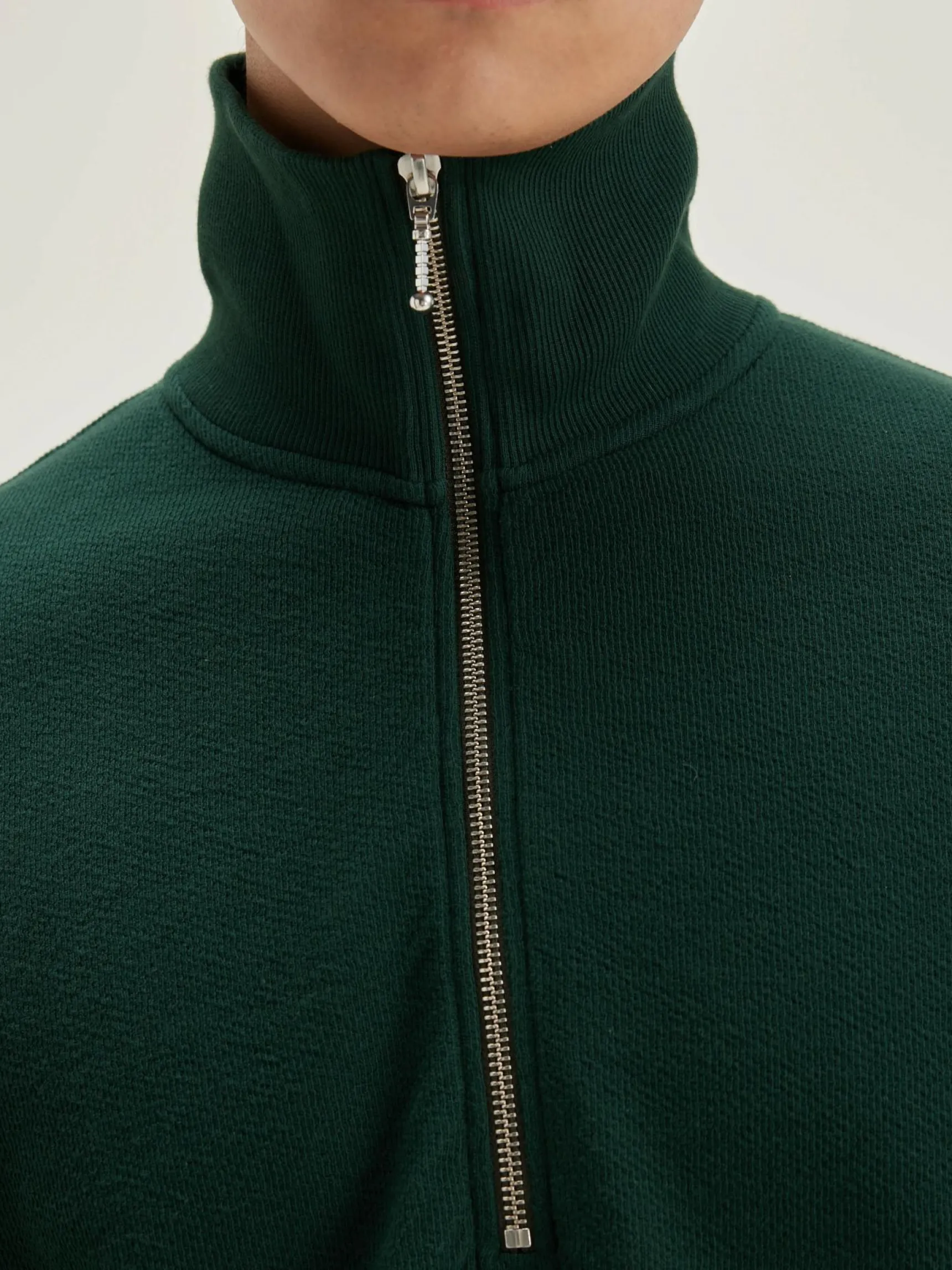 - Opstaande, geribde kraag met halve ritssluiting