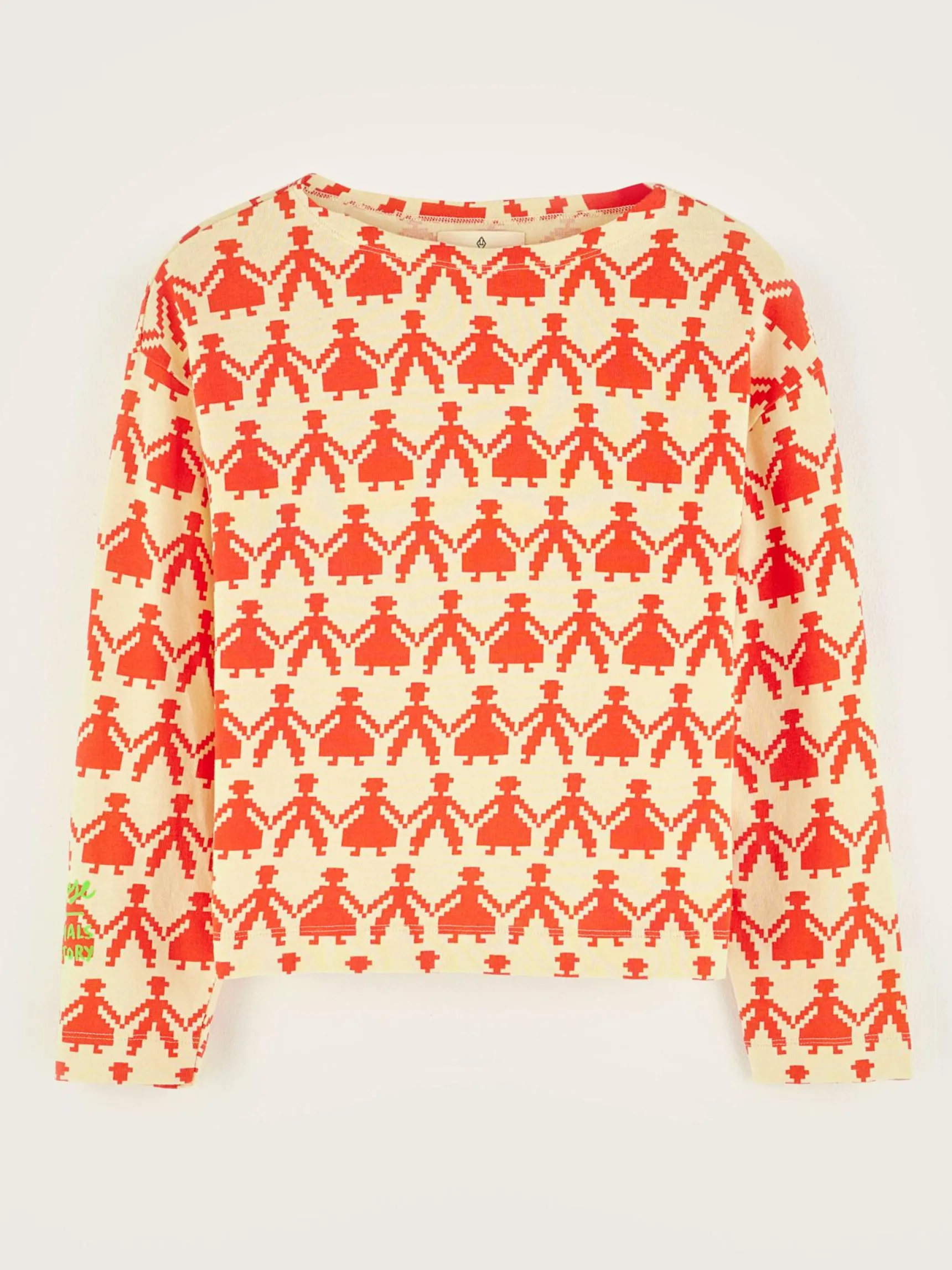 Geel katoenen T-shirt met lange flared mouwen en volledig bedrukt met gepixeleerde figuren.