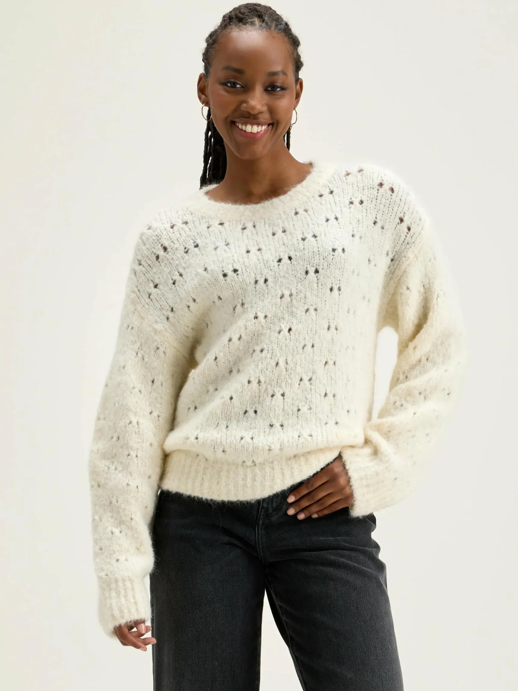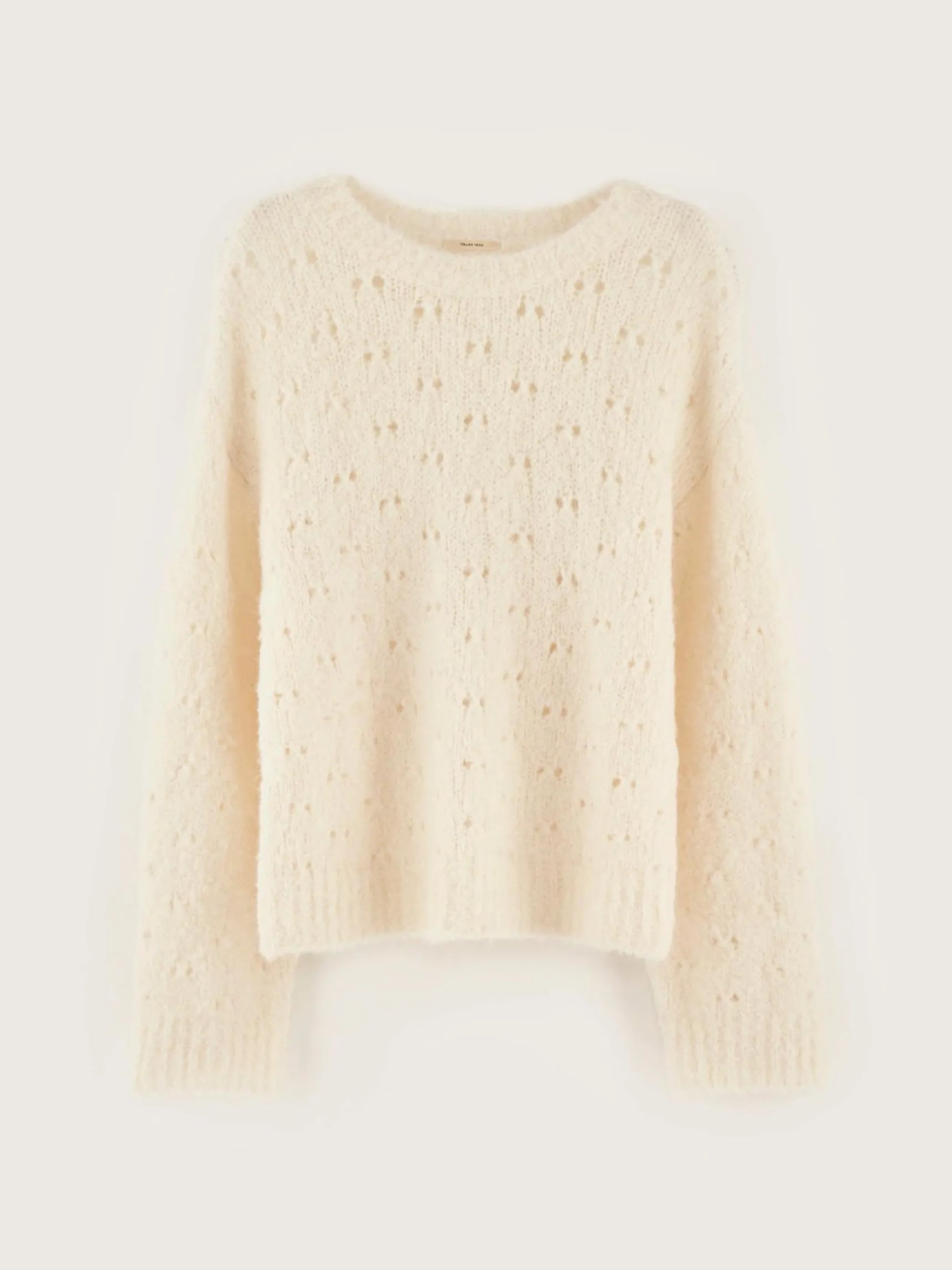 Klassieke trui van open breiwerk in gebroken wit.