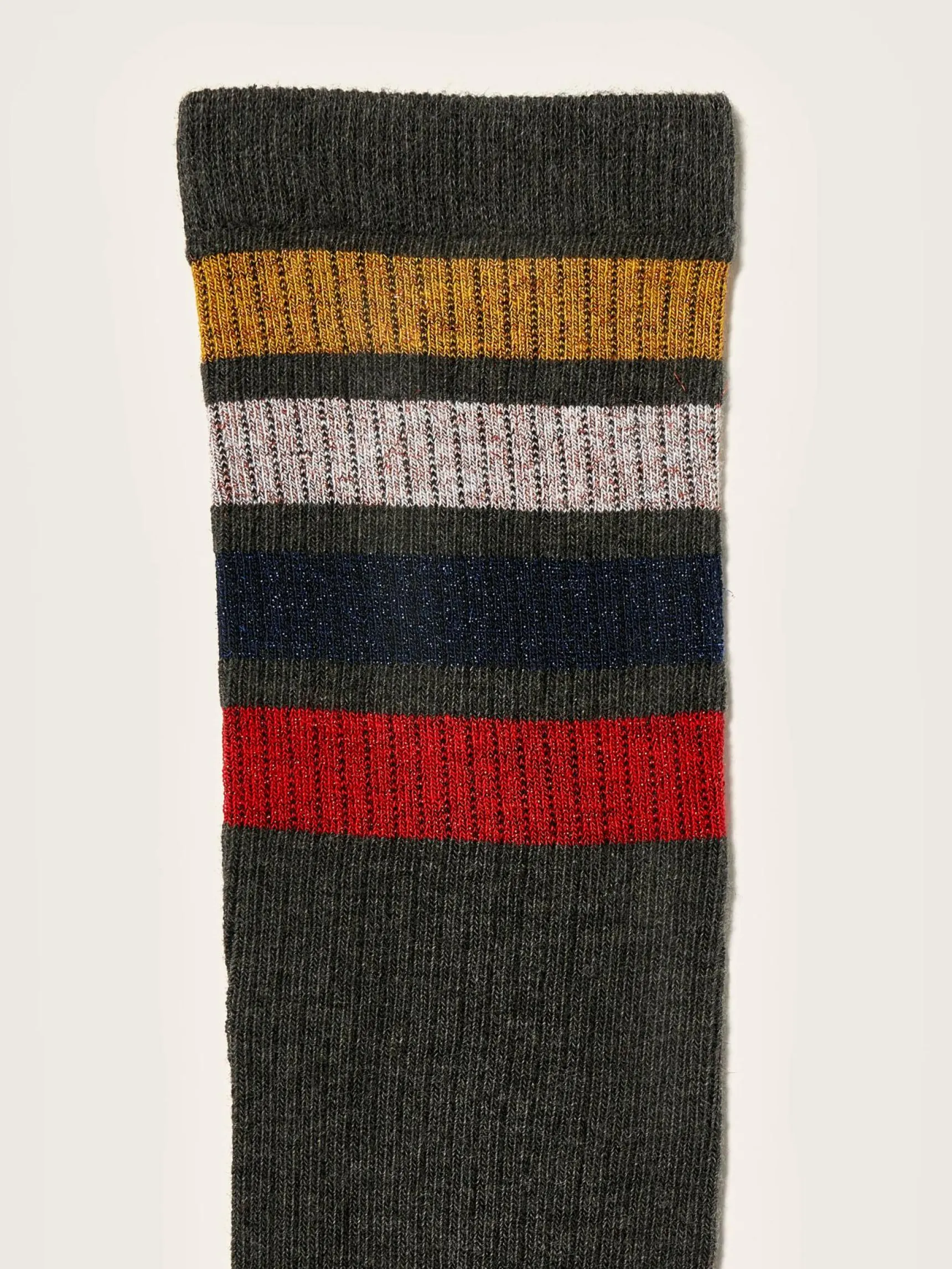 Donkergrijze kniekousen met lurexstrepen.