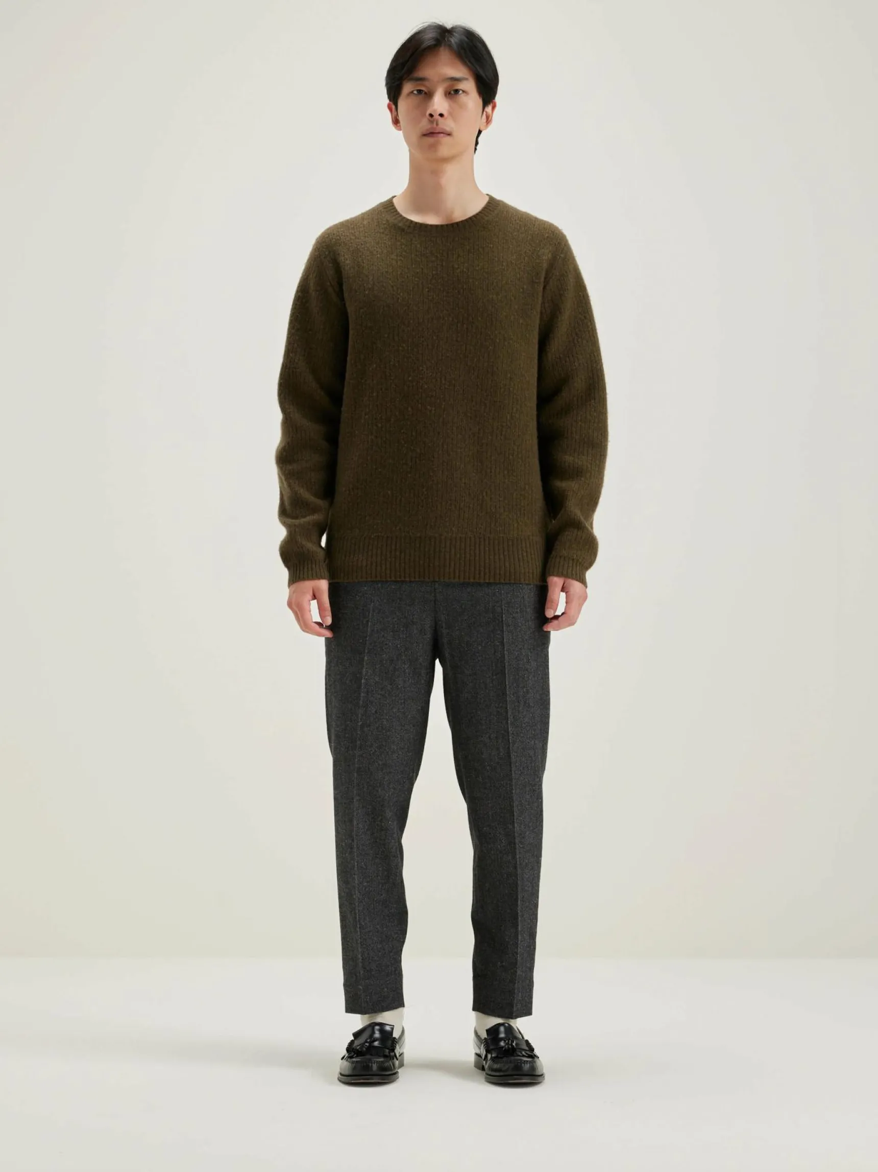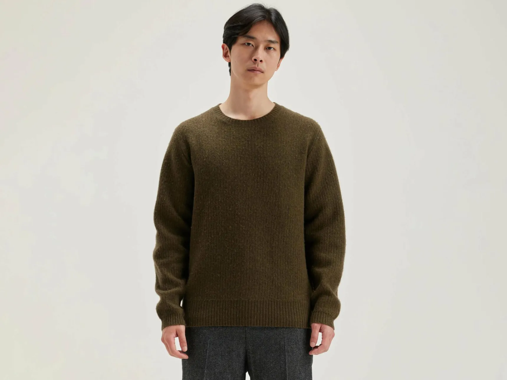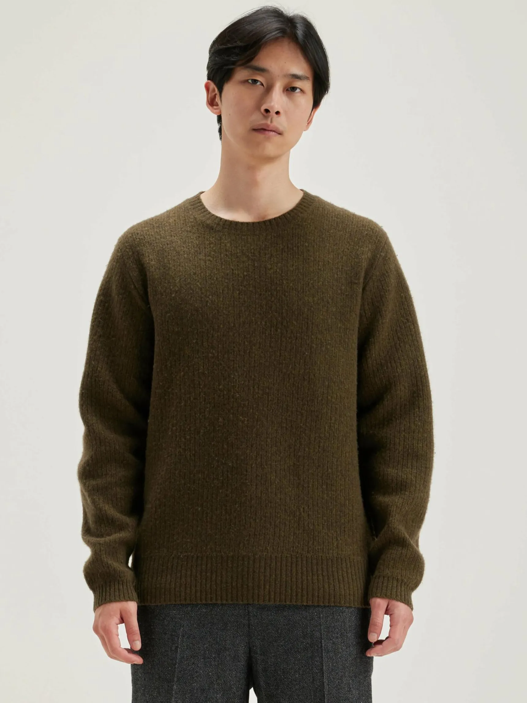 Classic fit, geribde, kakigroene sweater van merinowol.