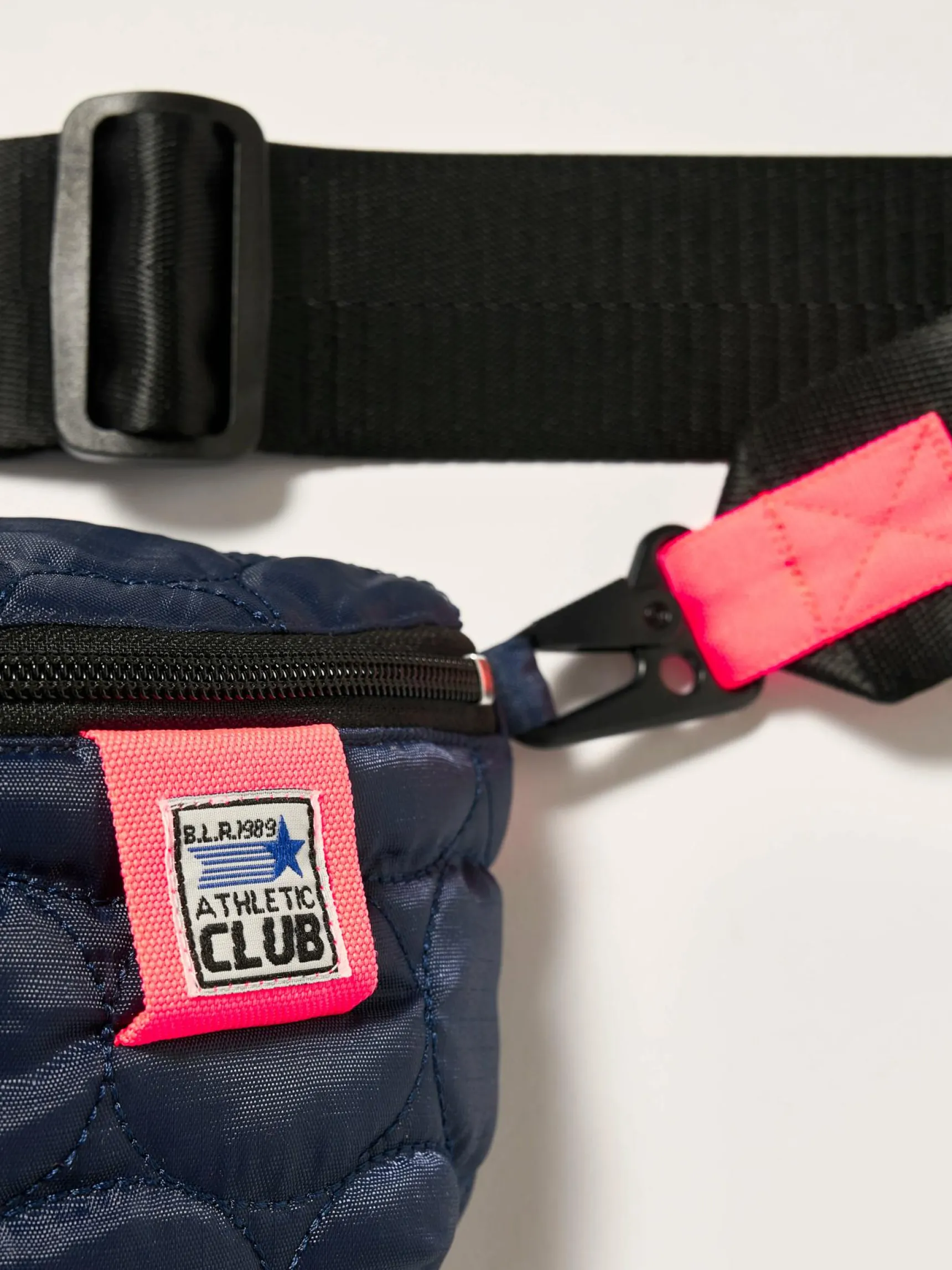 Marineblauwe gewatteerde heuptas in ripstop stof, met details geïnspireerd op klimuitrusting.
