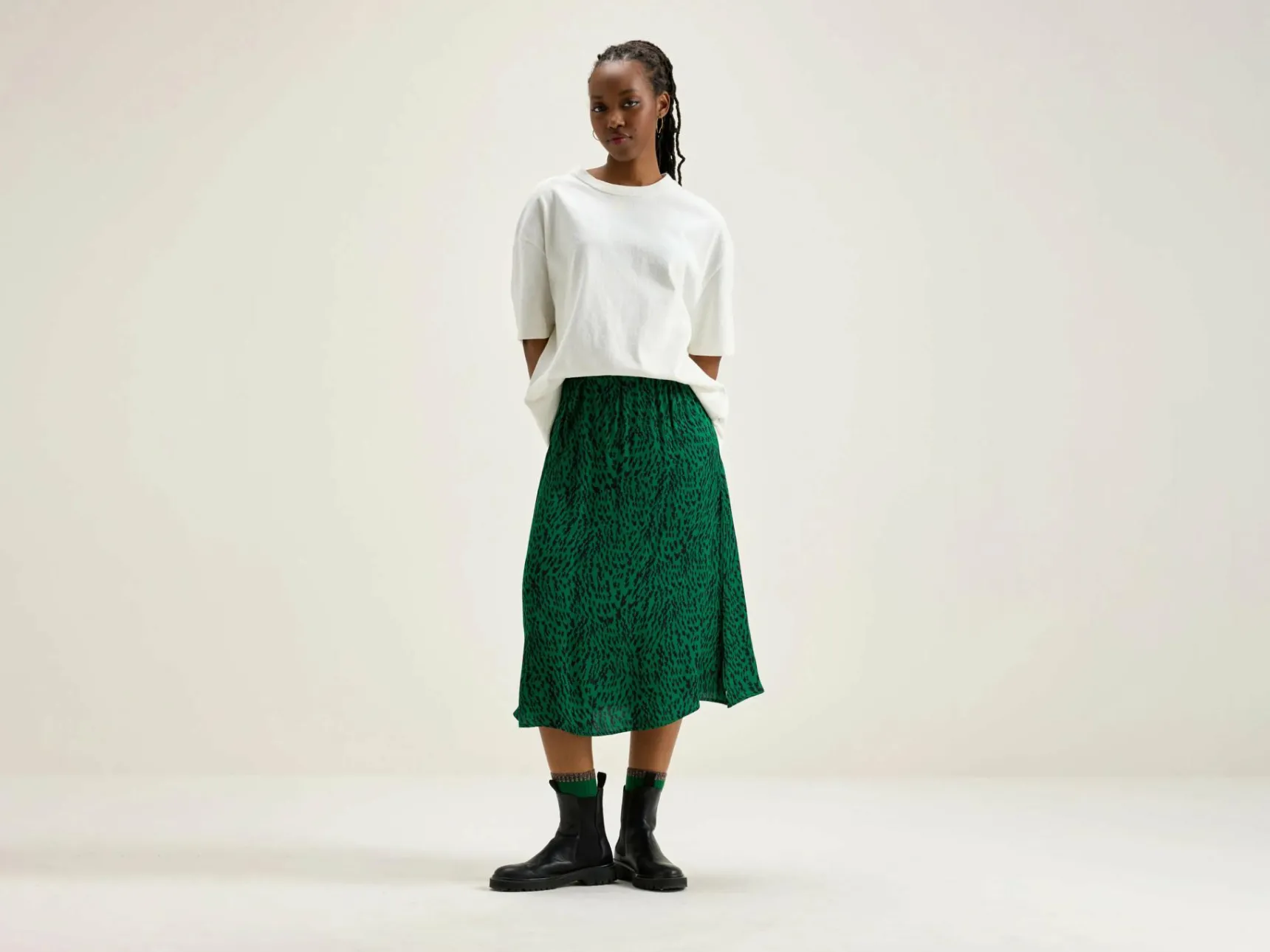 Midirok met elastische tailleband en diepe zijsplitten, van groene viscose met luipaardprint.