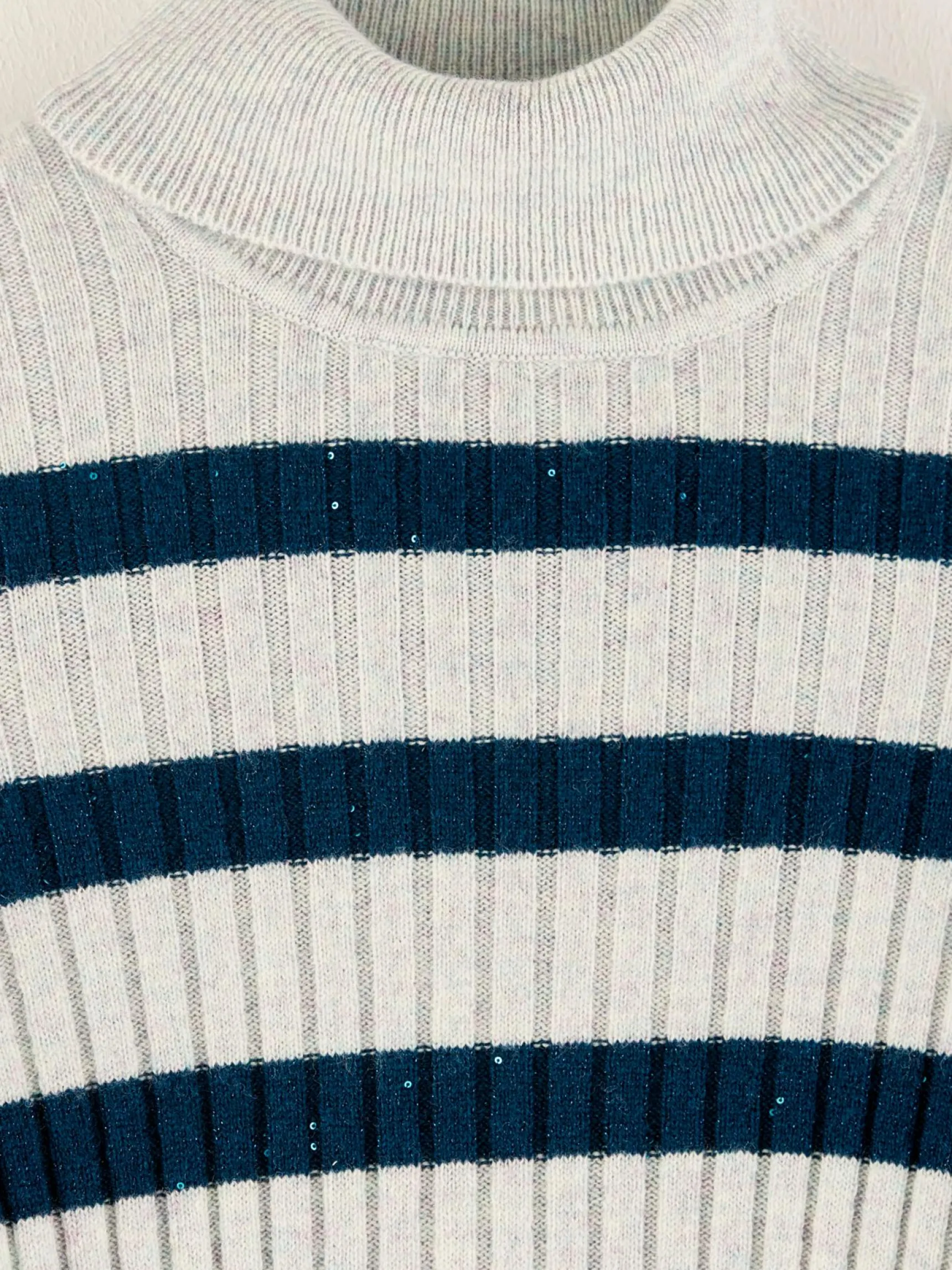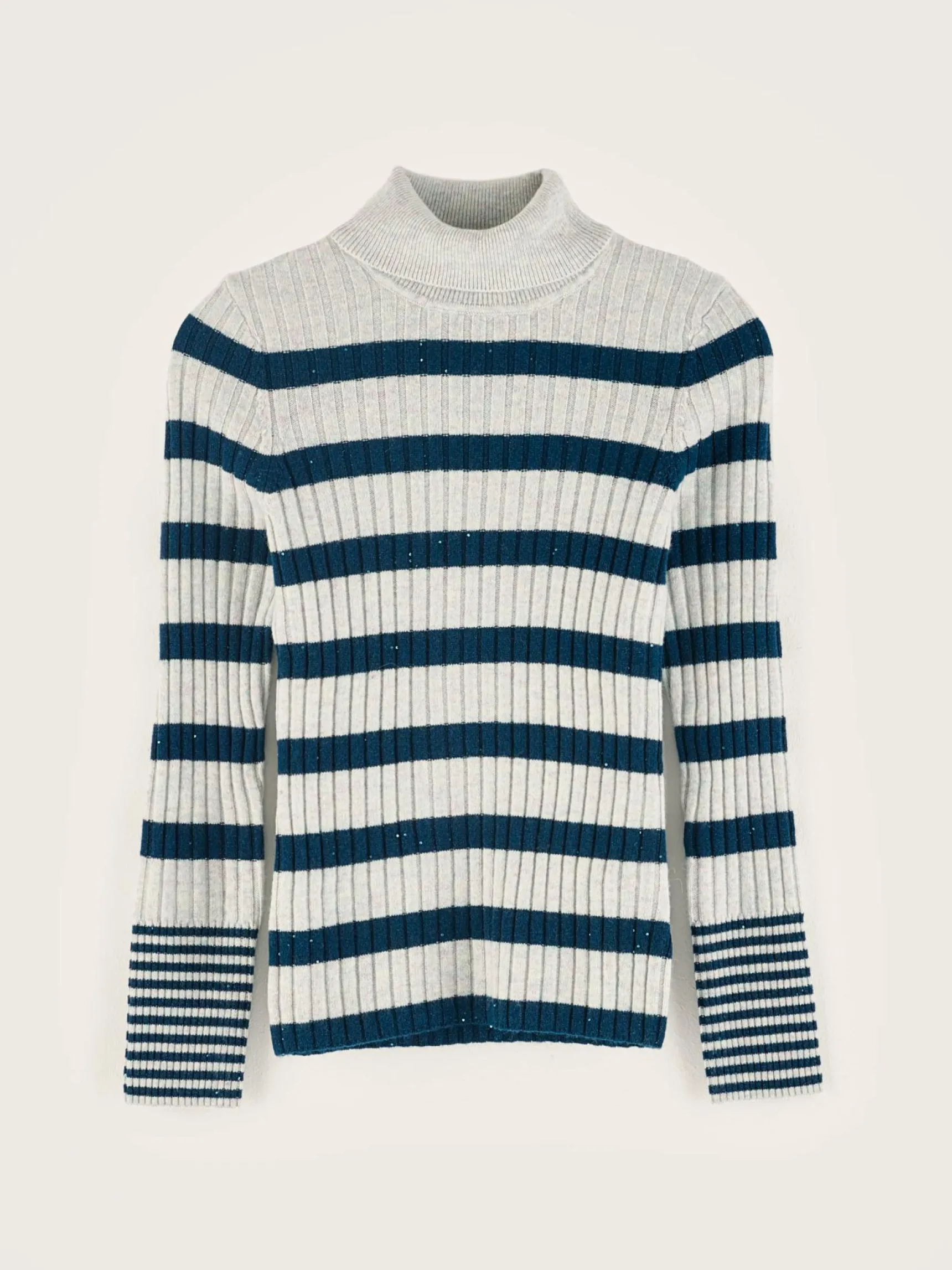 Aansluitende trui met hoge hals, van ribtricot. Met merinowol en glanzende strepen.