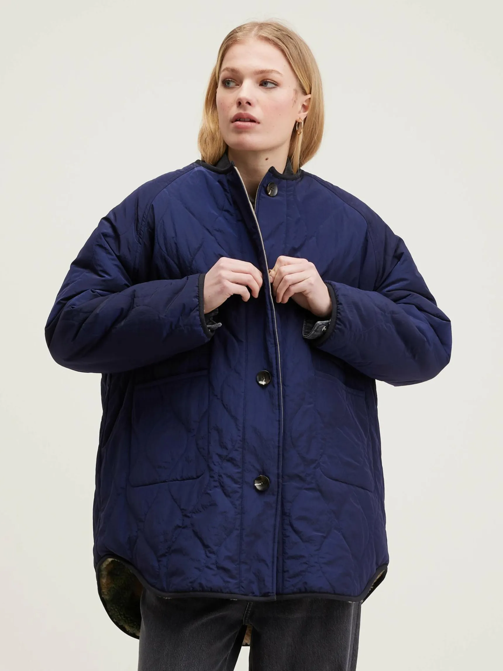 Omkeerbaar oversized marineblauw gewatteerd jack met camo-print en teddyvoering.