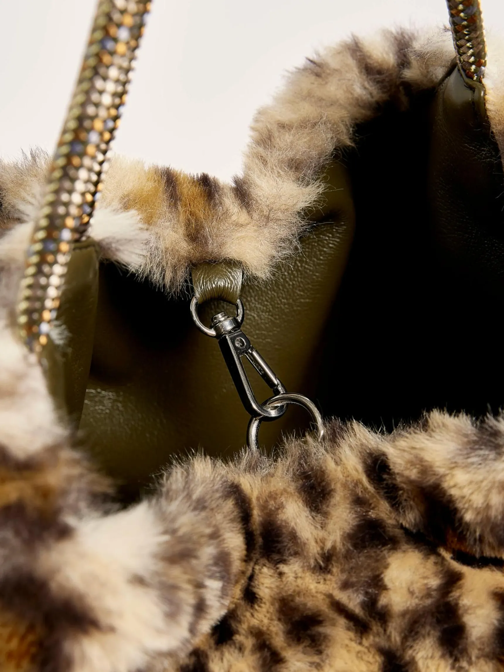 Omkeerbare handtas van nepbont met handvaten bovenaan en een afneembare schouderriem. De ene kant is gemaakt van nepbont met luipaardprint, de andere is van kaki imitatieleer.