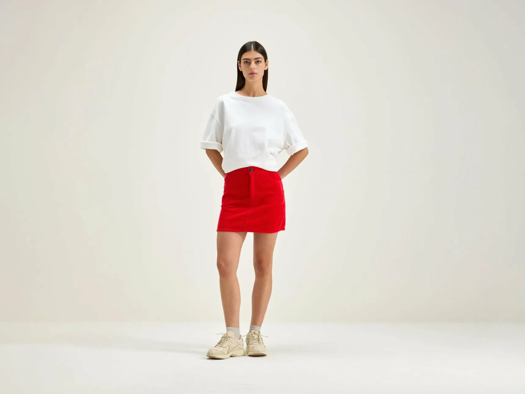 Donkerrode, trapeziumvormige minirok in five-pocketstijl, corduroy met brede rib.