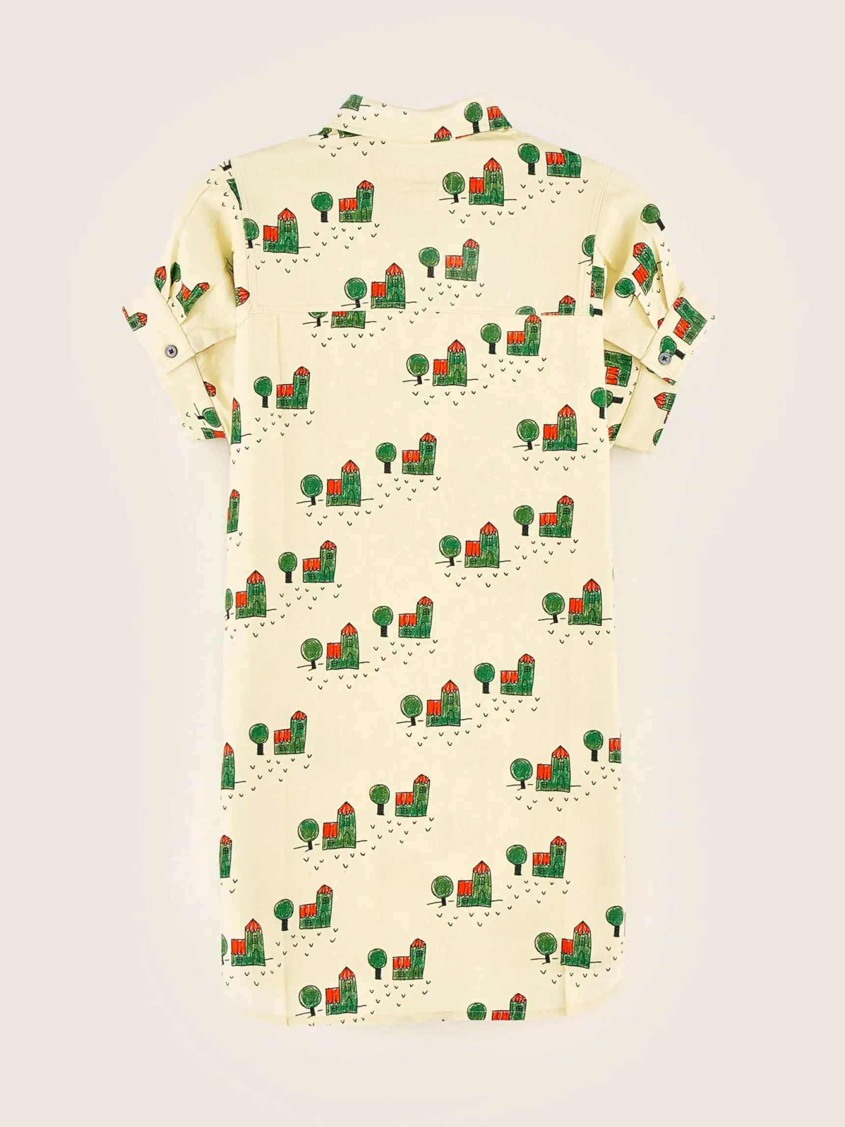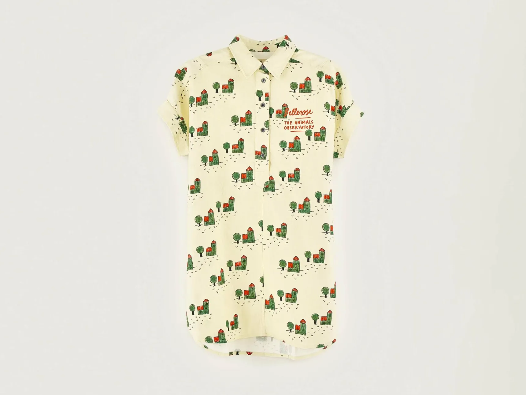 Rechte hemdjurk van geel katoen, volledig bedrukt met een boerderijprint en Bellerose x The Animal Observatory-signatuur.