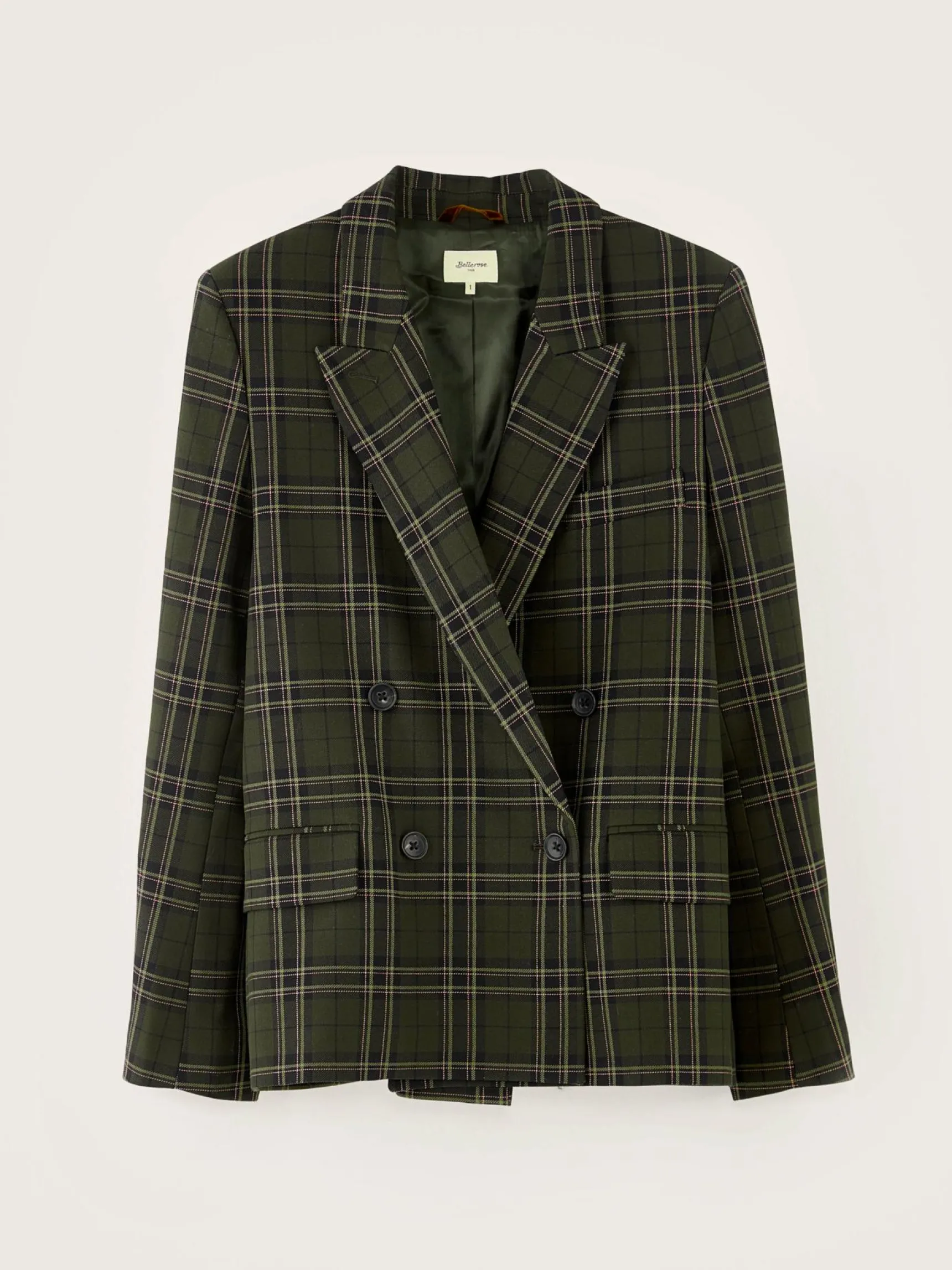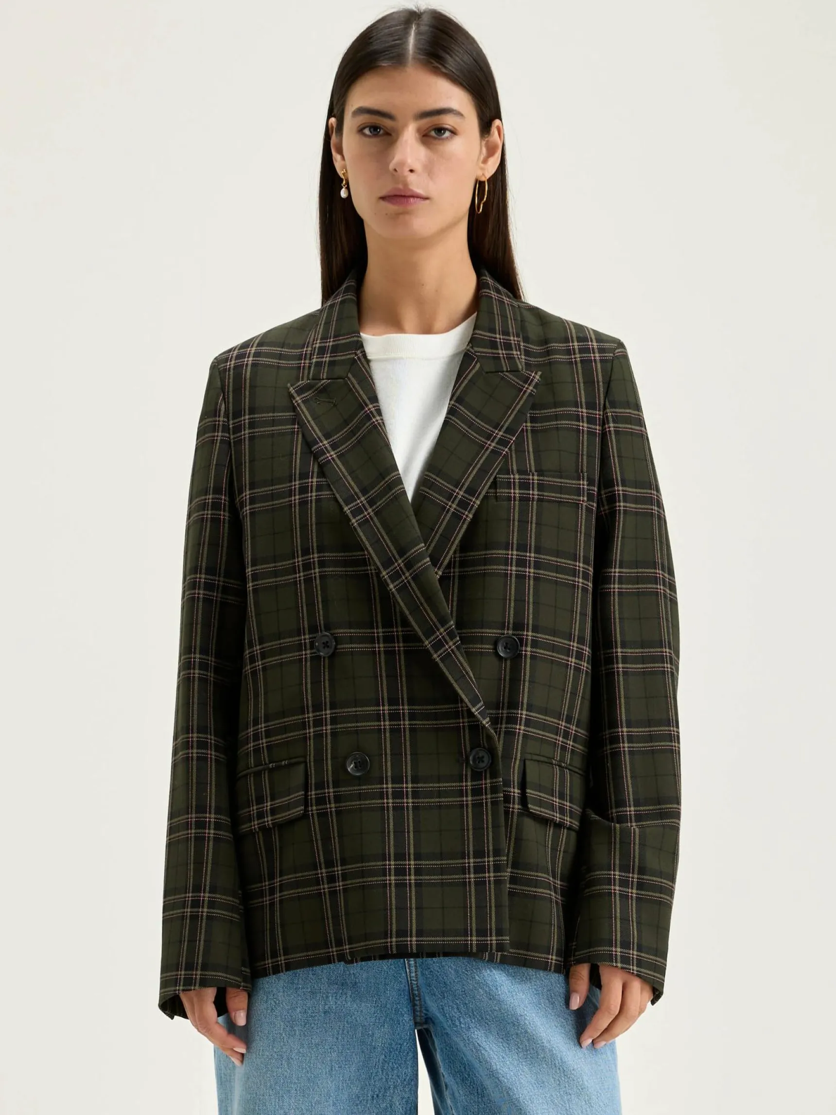 Double-breasted, oversizede blazer met recht model, in een kaki geruite stof.