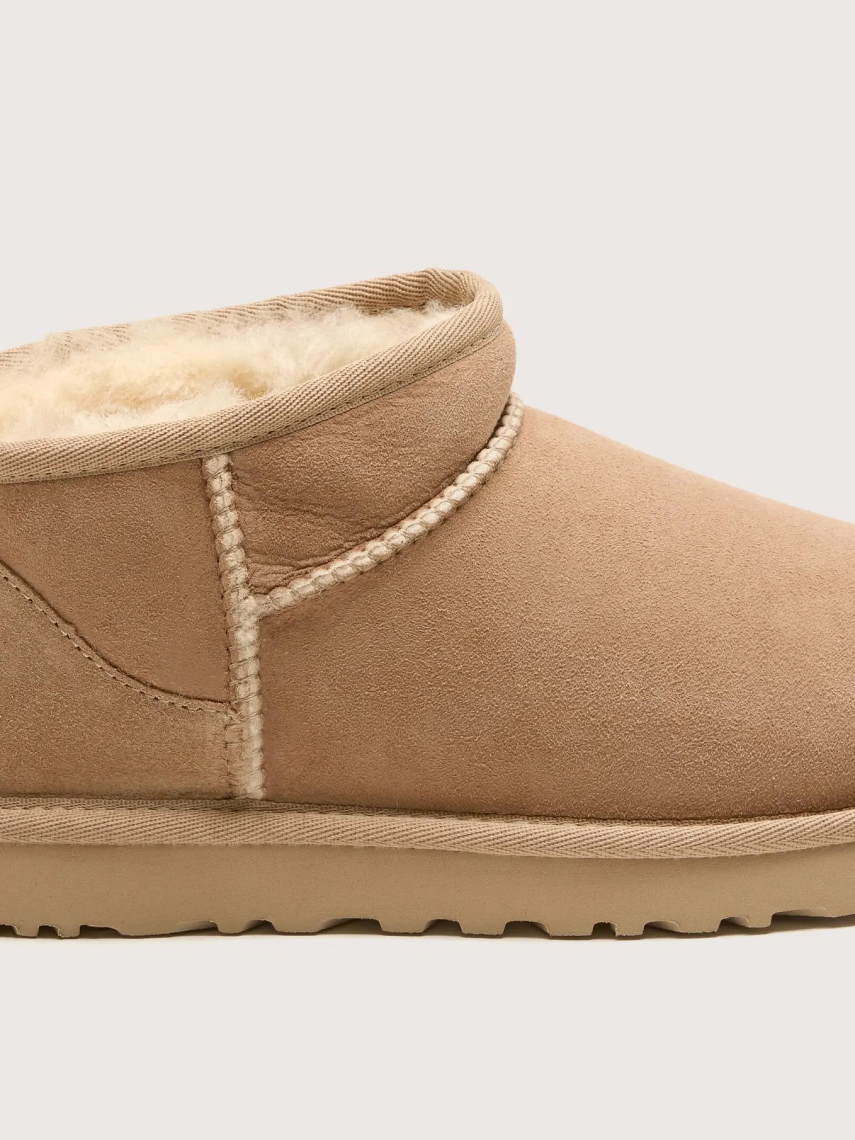 De UGG Classic Ultra Mini laars heeft een verlaagde asymmetrische schacht en een bovenkant van sheepskin met een waterafstotende behandeling.