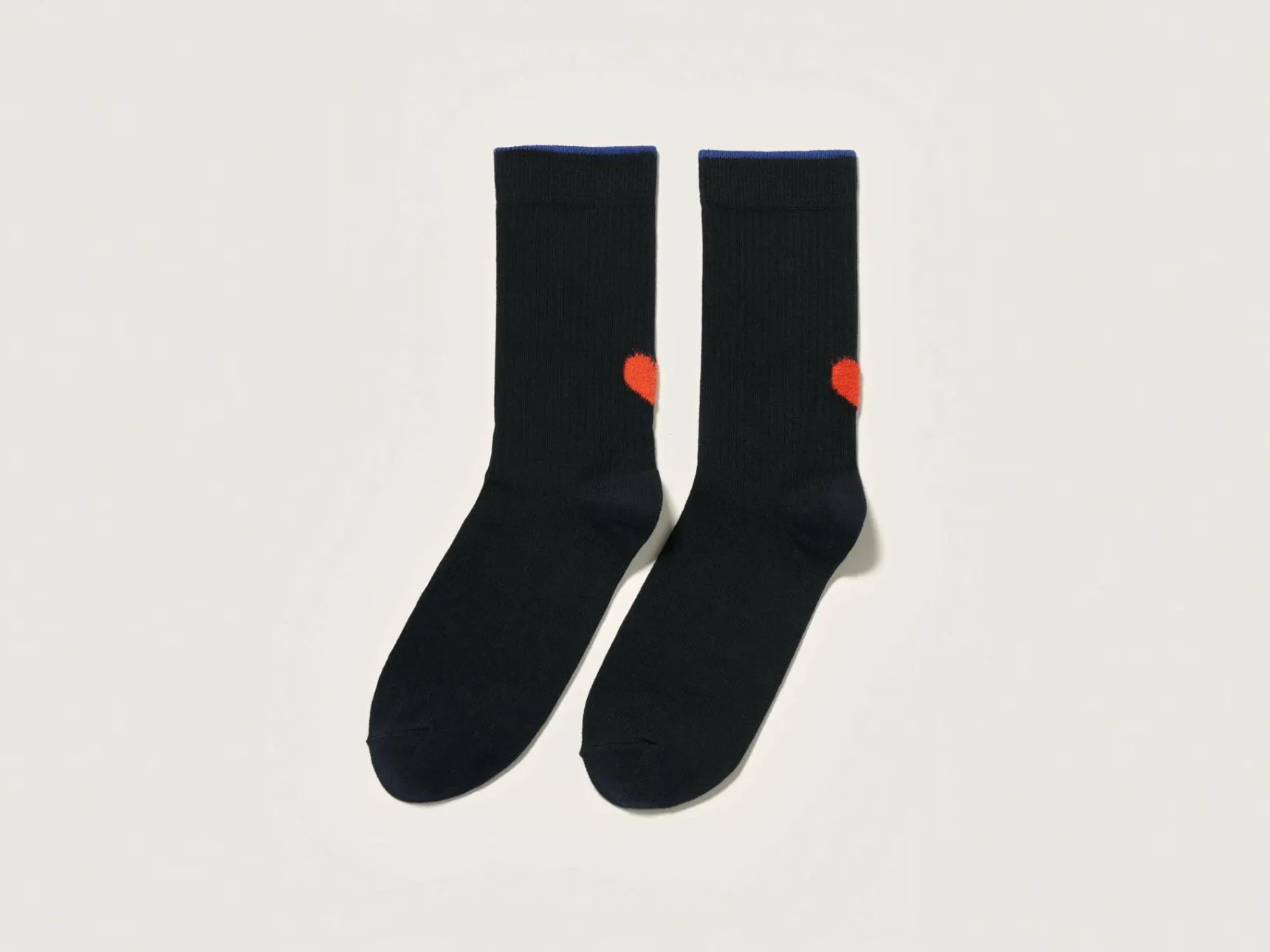 Klassieke, marineblauwe sokken met een contrasterend hart op de hiel