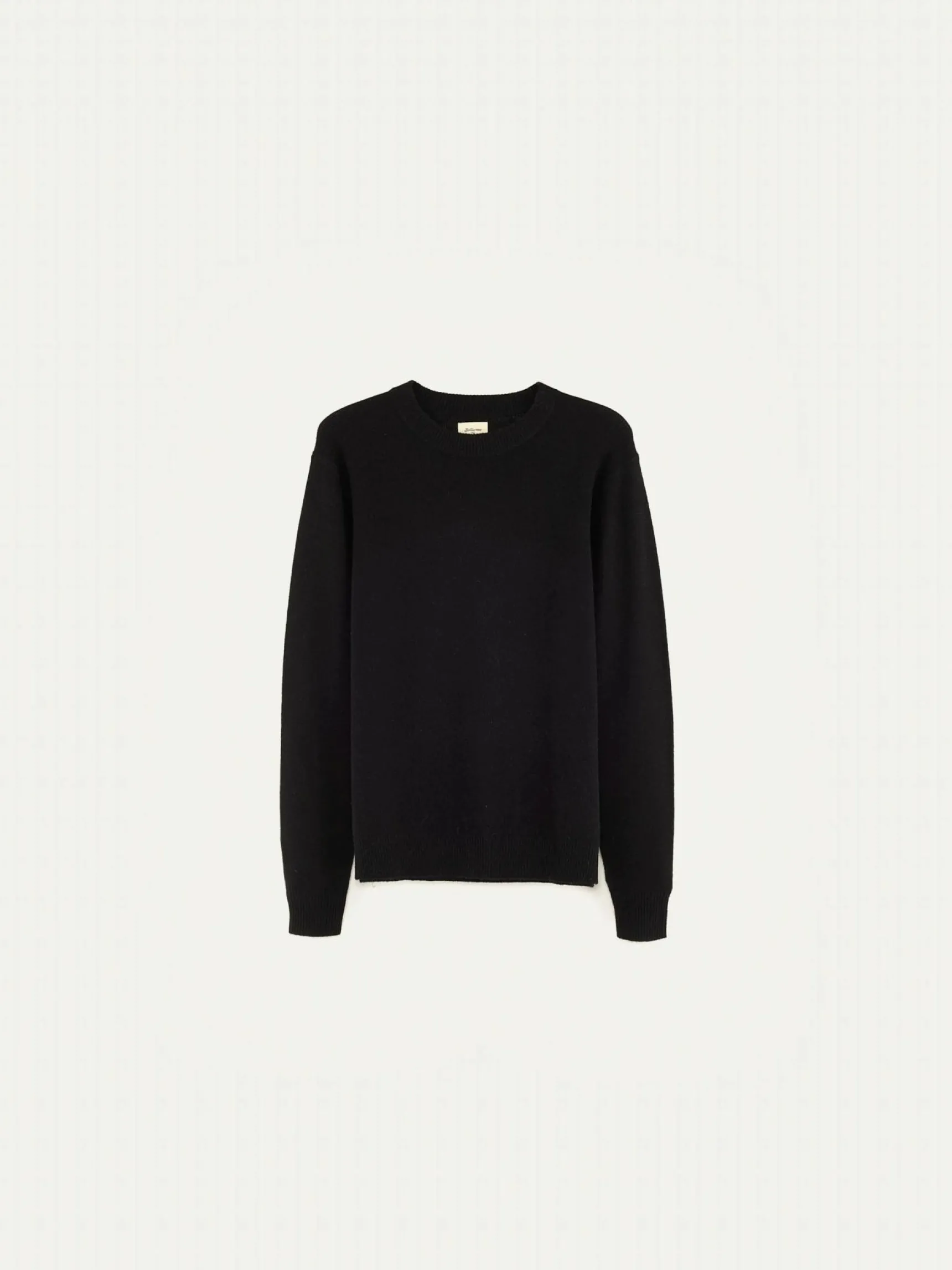 Klassieke, zwarte sweater met ronde hals, van merinowol.