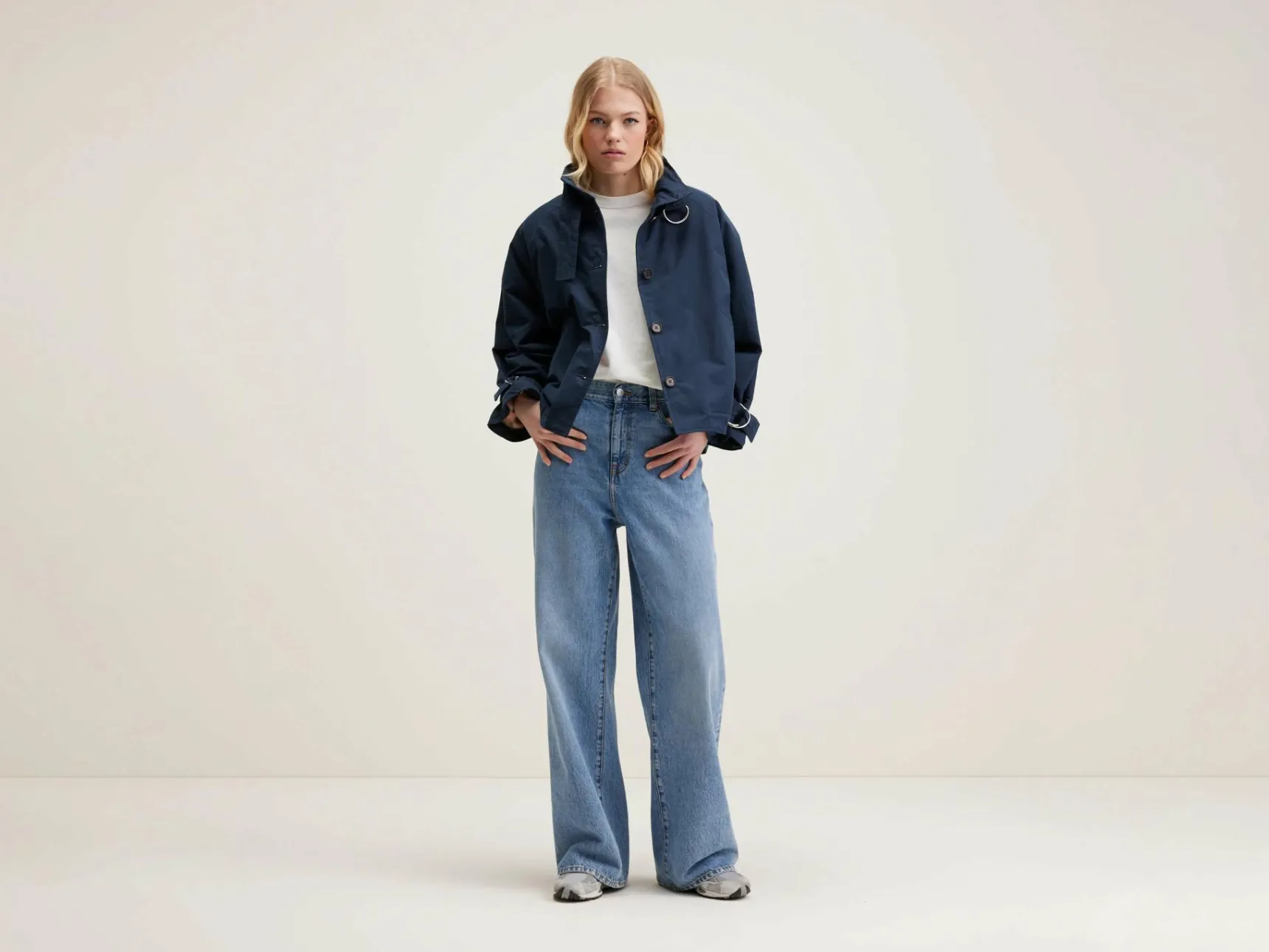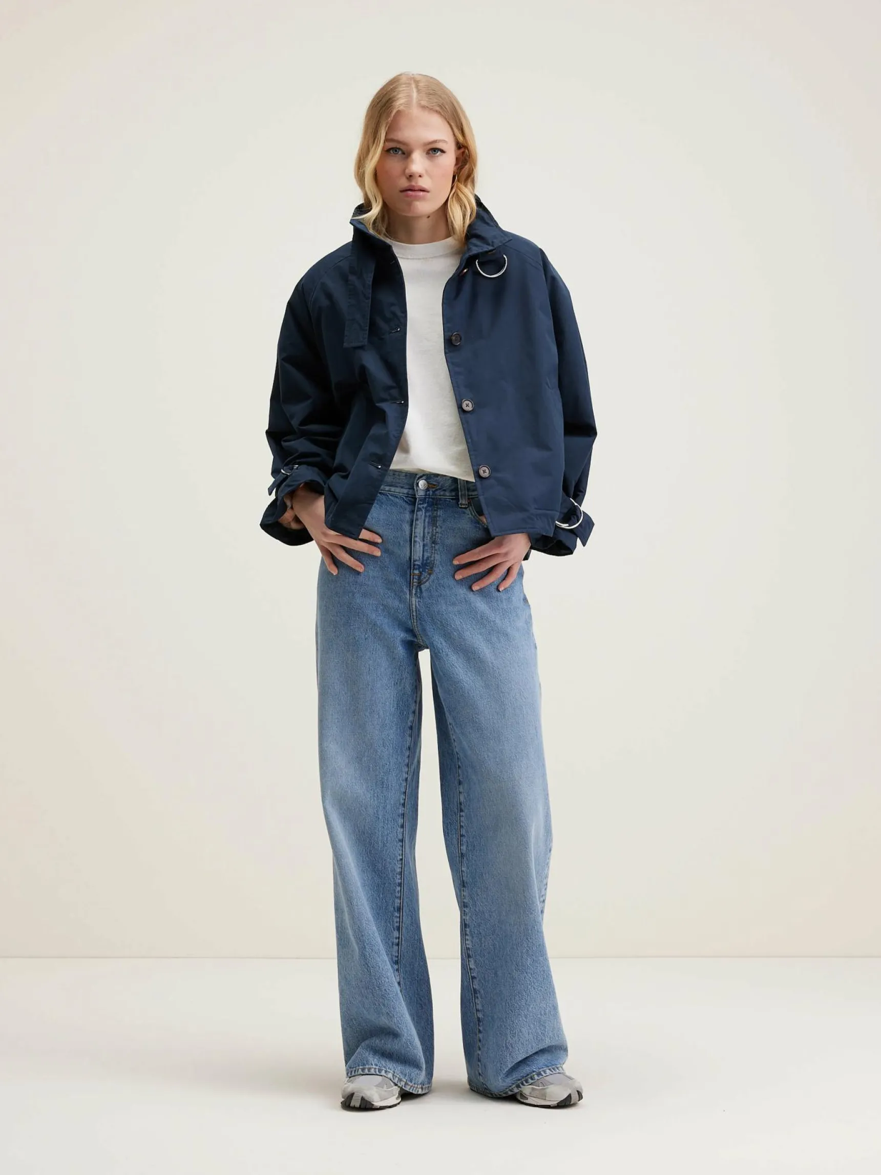 Korte, donkerblauwe oversizede jas in trenchcoatstijl.
