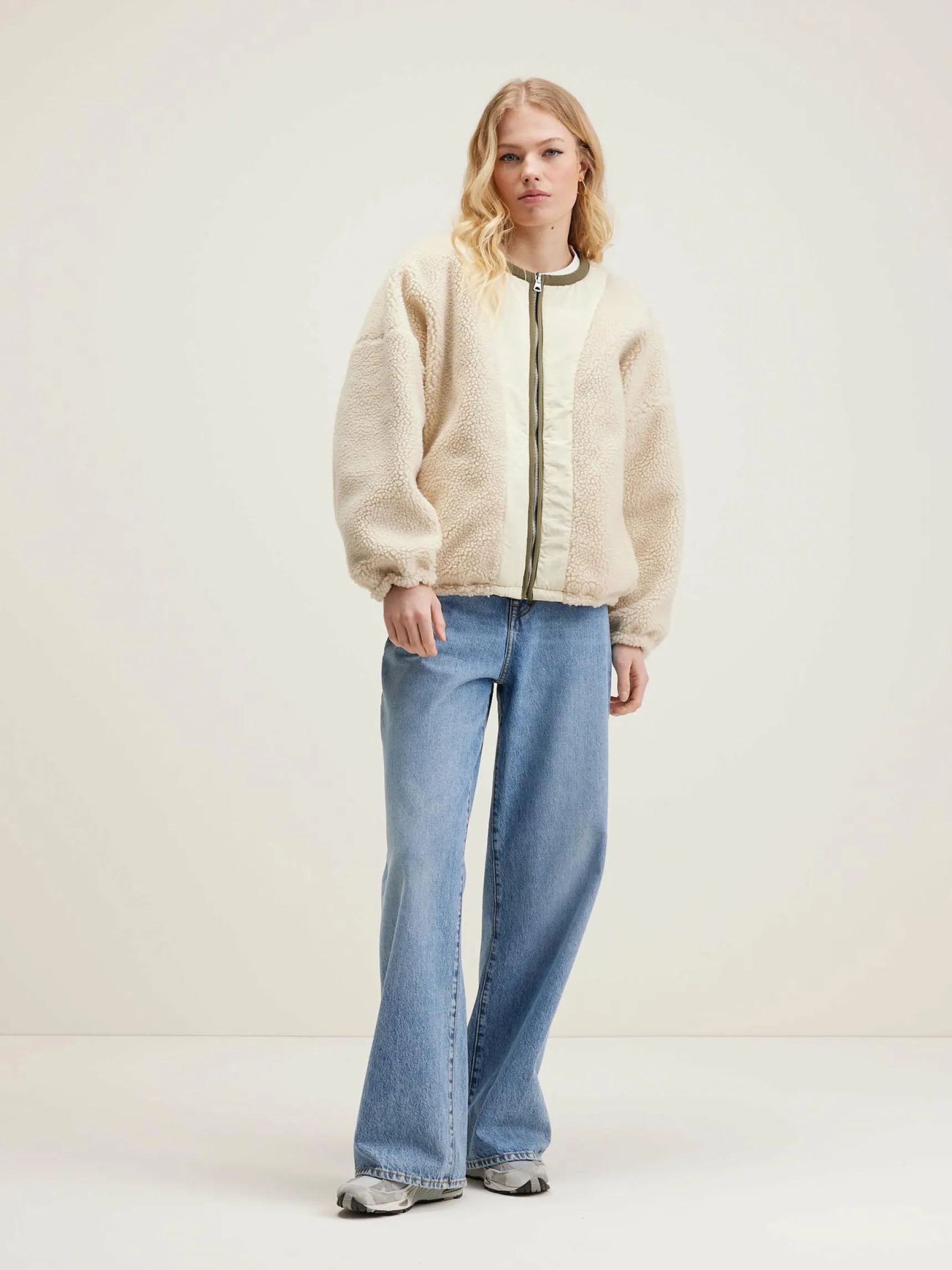 Omkeerbare en oversizede jas met één kant in ecru teddy en de andere kant in marineblauw nylon.