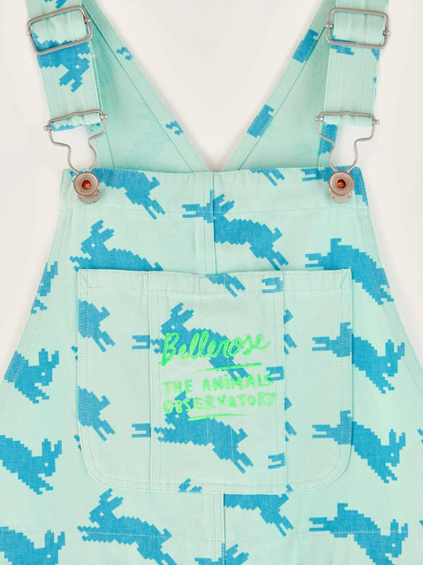Comfortabele blauwe katoenen salopette, volledig bedrukt met konijnmotief en Bellerose x The Animal Observatory-signatuur.