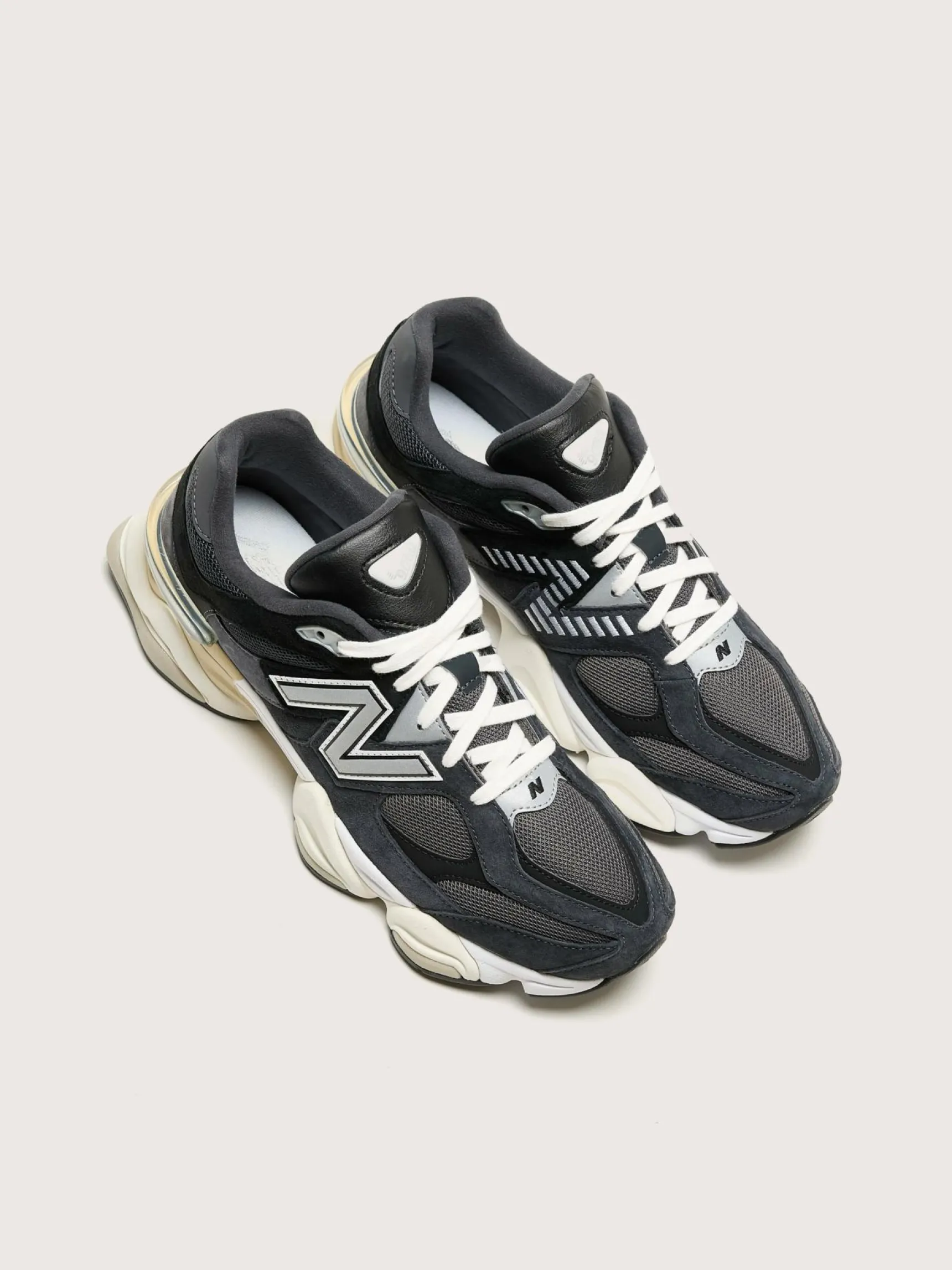 De New Balance 9060 sneakers hebben een technisch bovenwerk van leder, suède en mesh, een dempende middenzool en een buitenzool met een diamanten patroon..