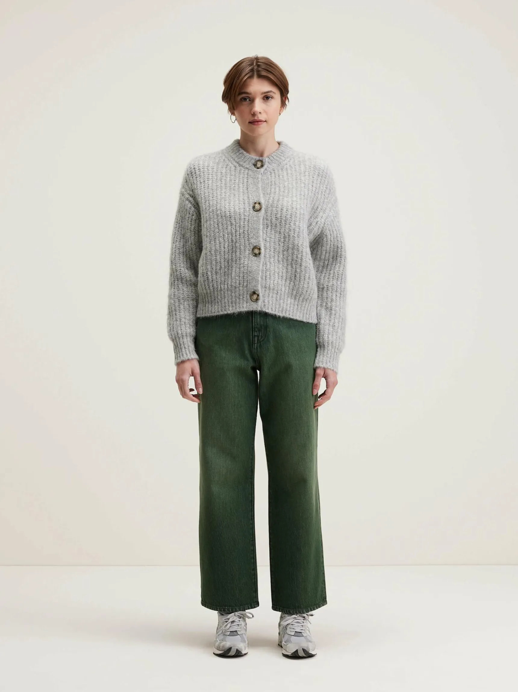 Klassieke, lichtgrijze cardigan van ribtricot.