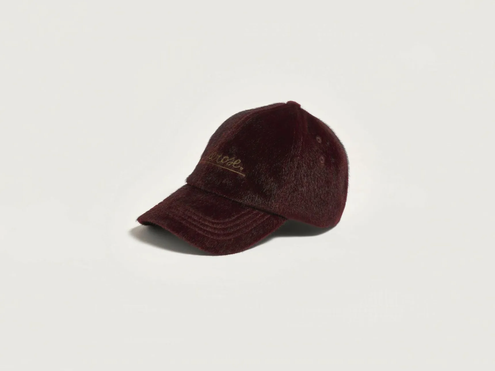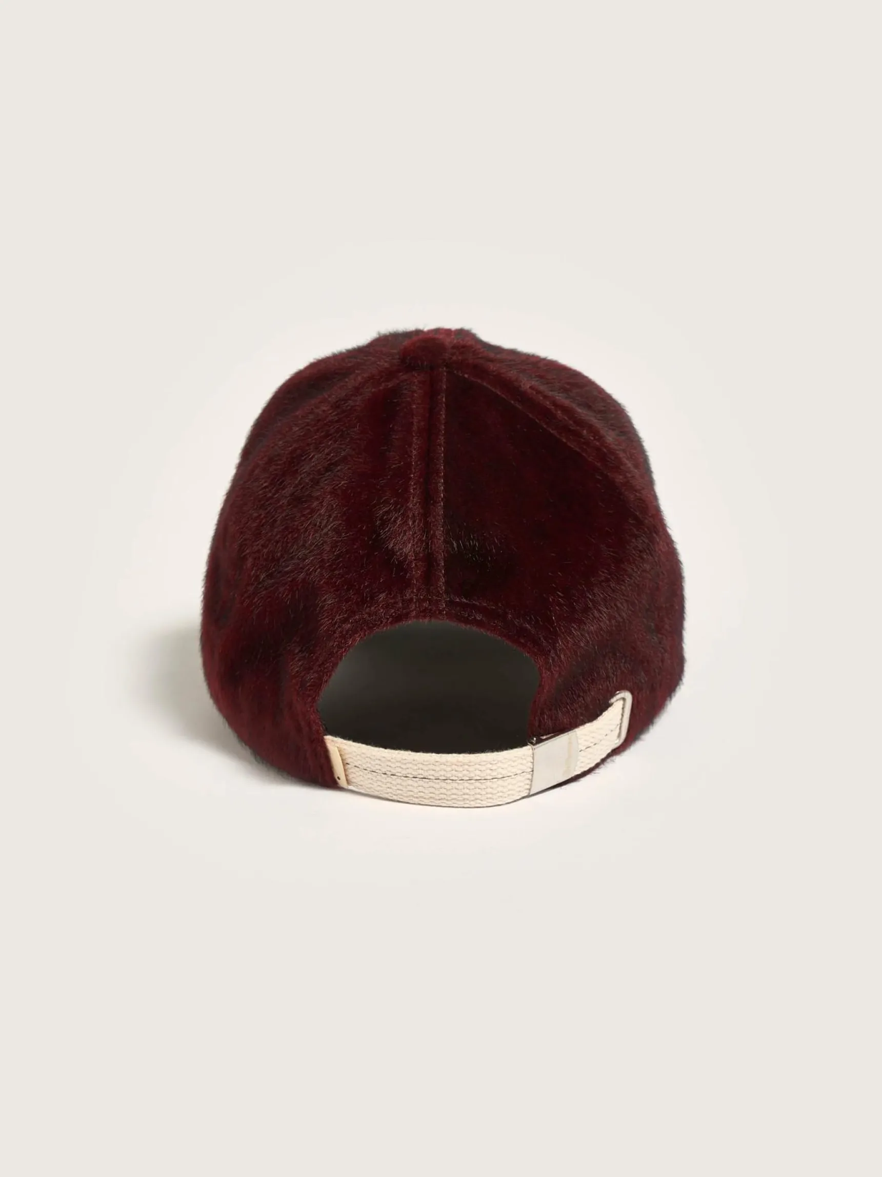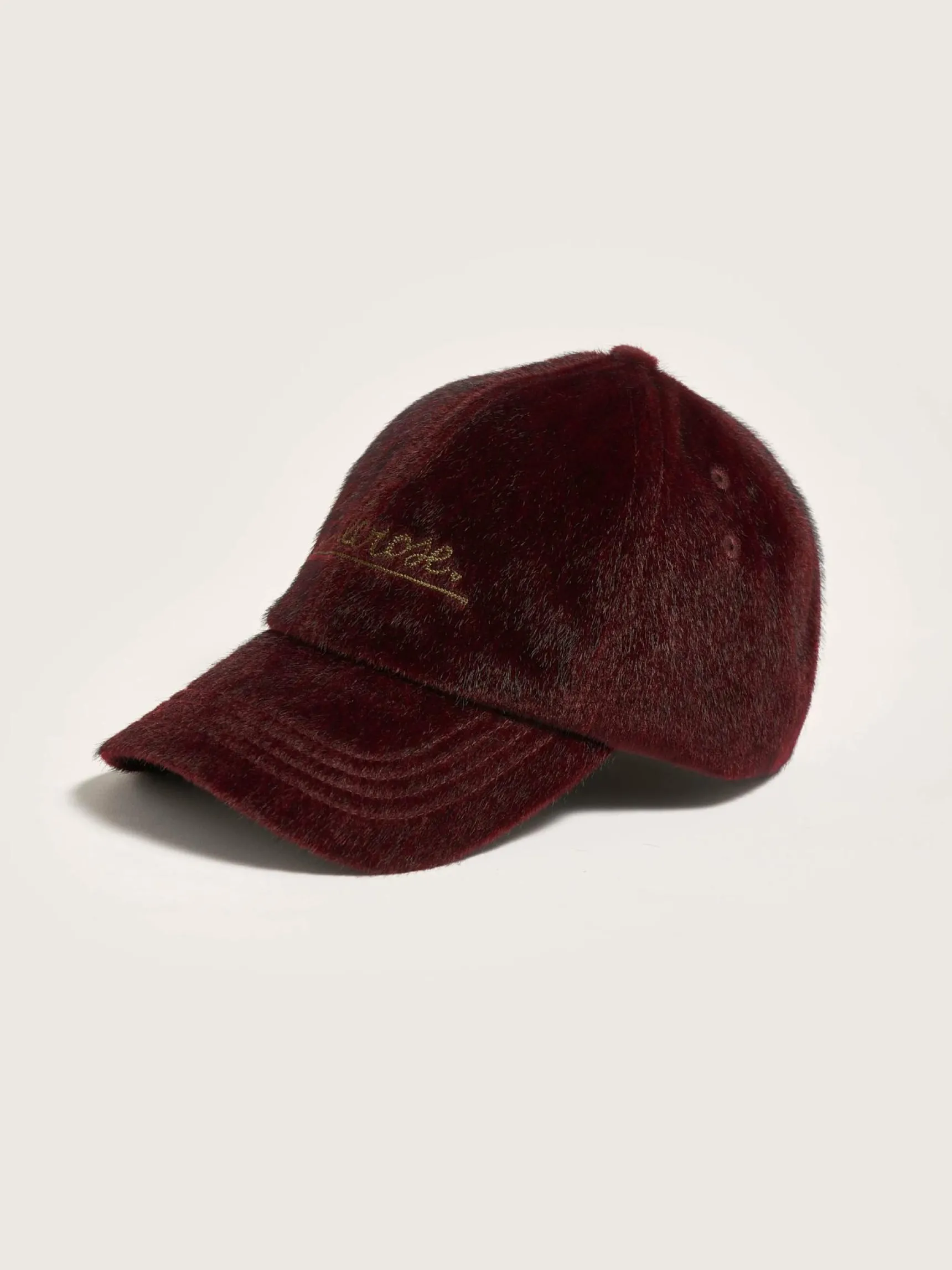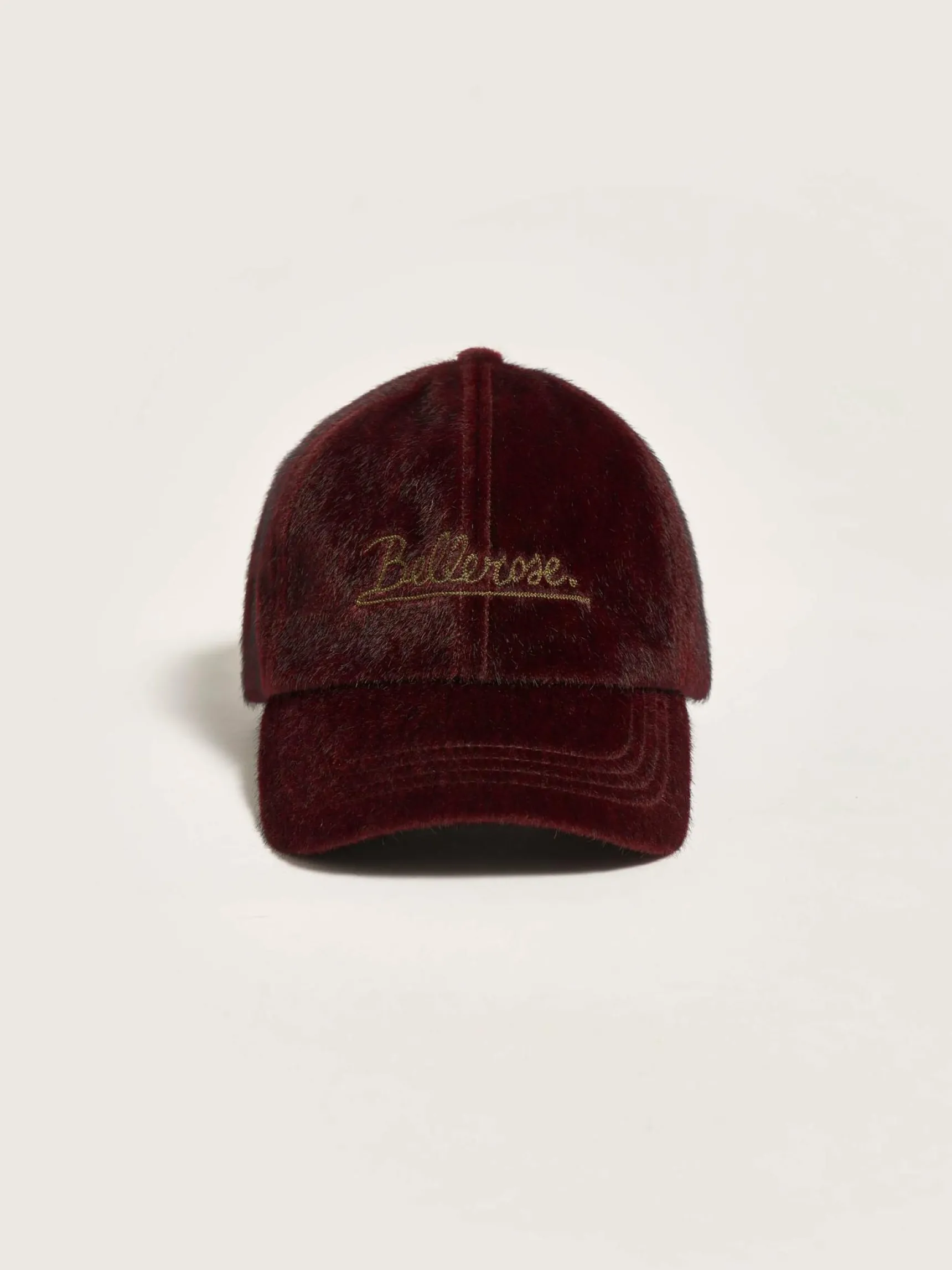 Klassieke, fluwelig granaatappelrode baseballpet met Bellerose-borduursel vooraan.