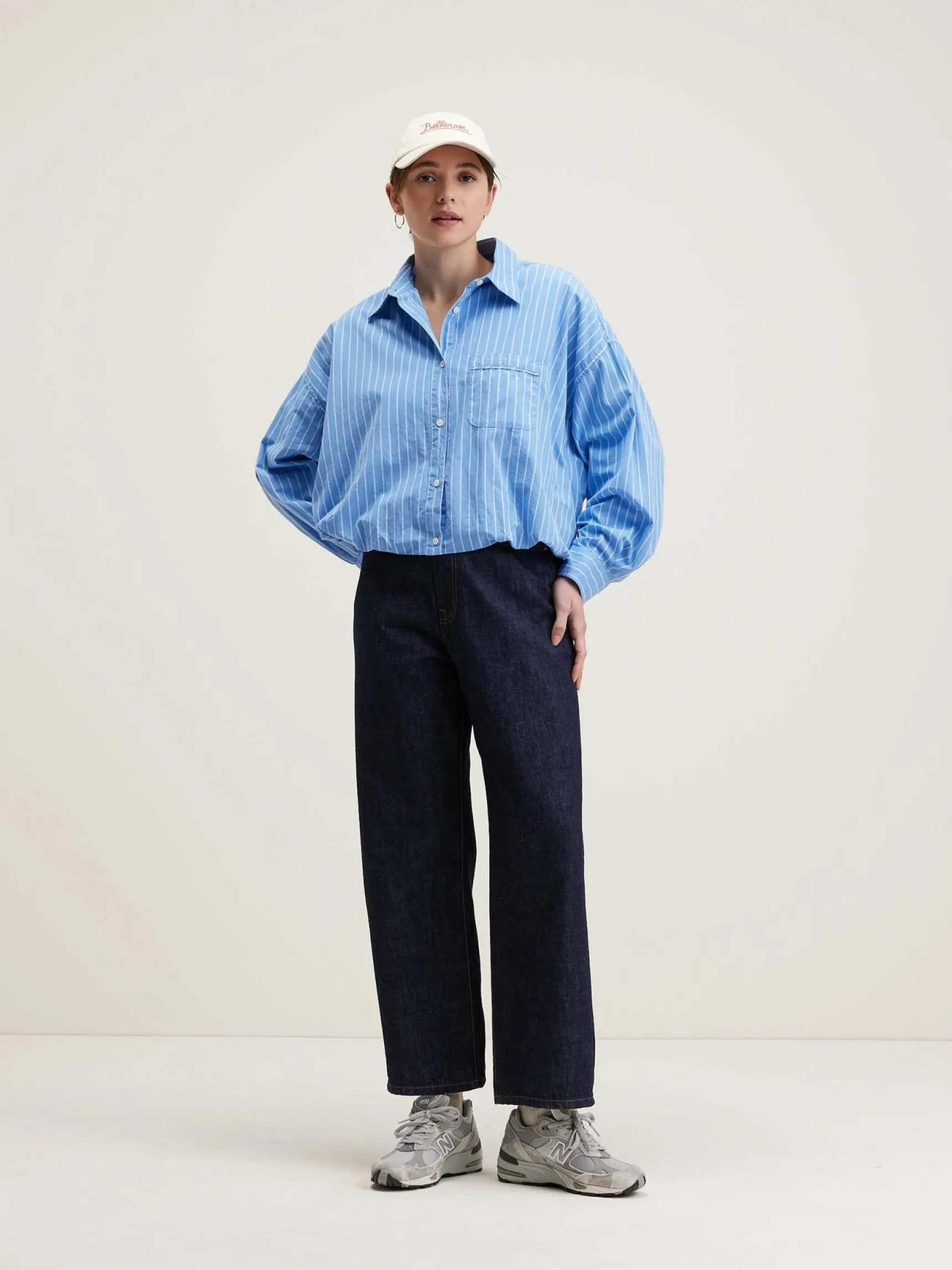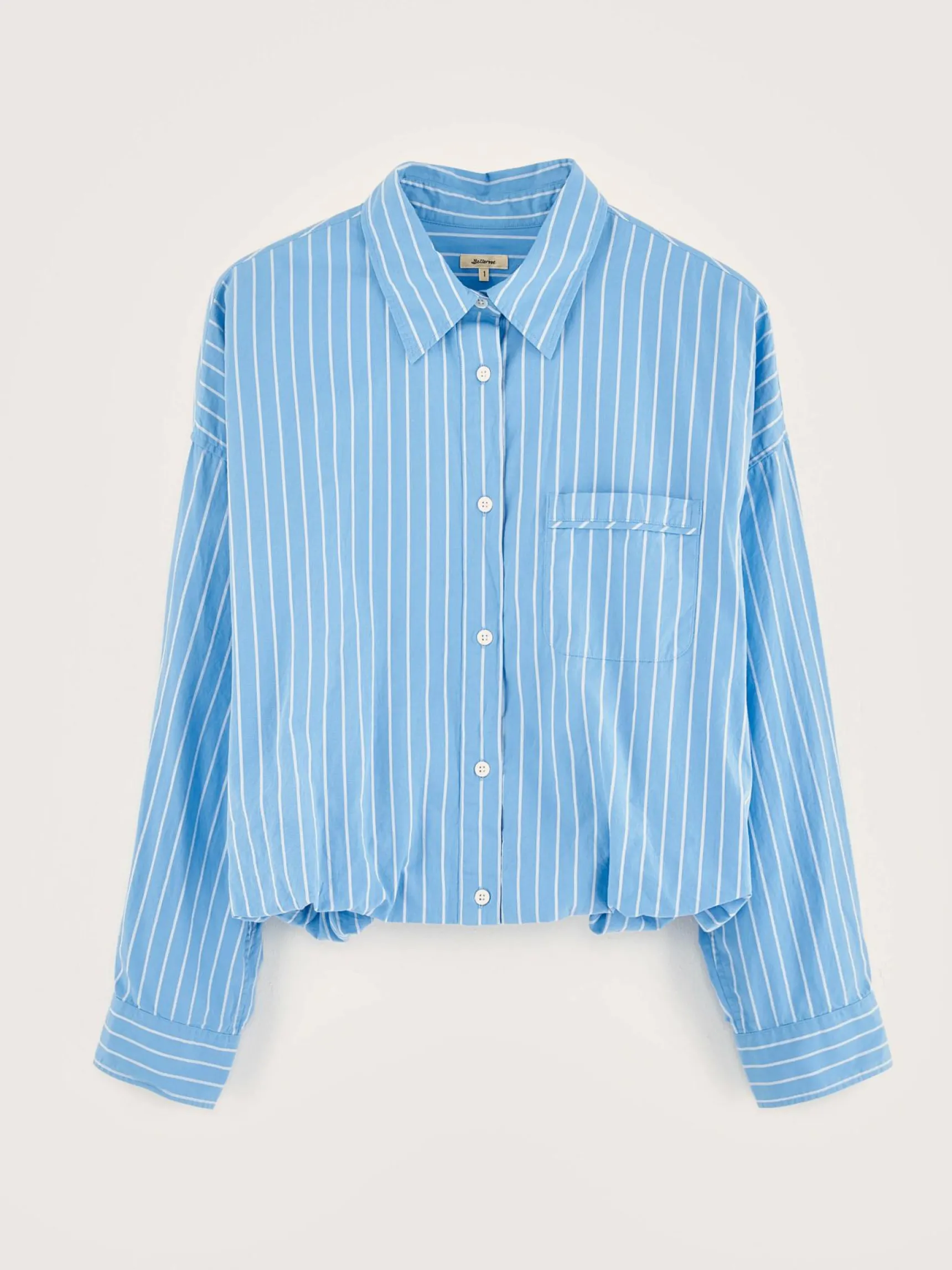 Volumineus overhemdvan gestreept katoen en linnen, met twee lagen.