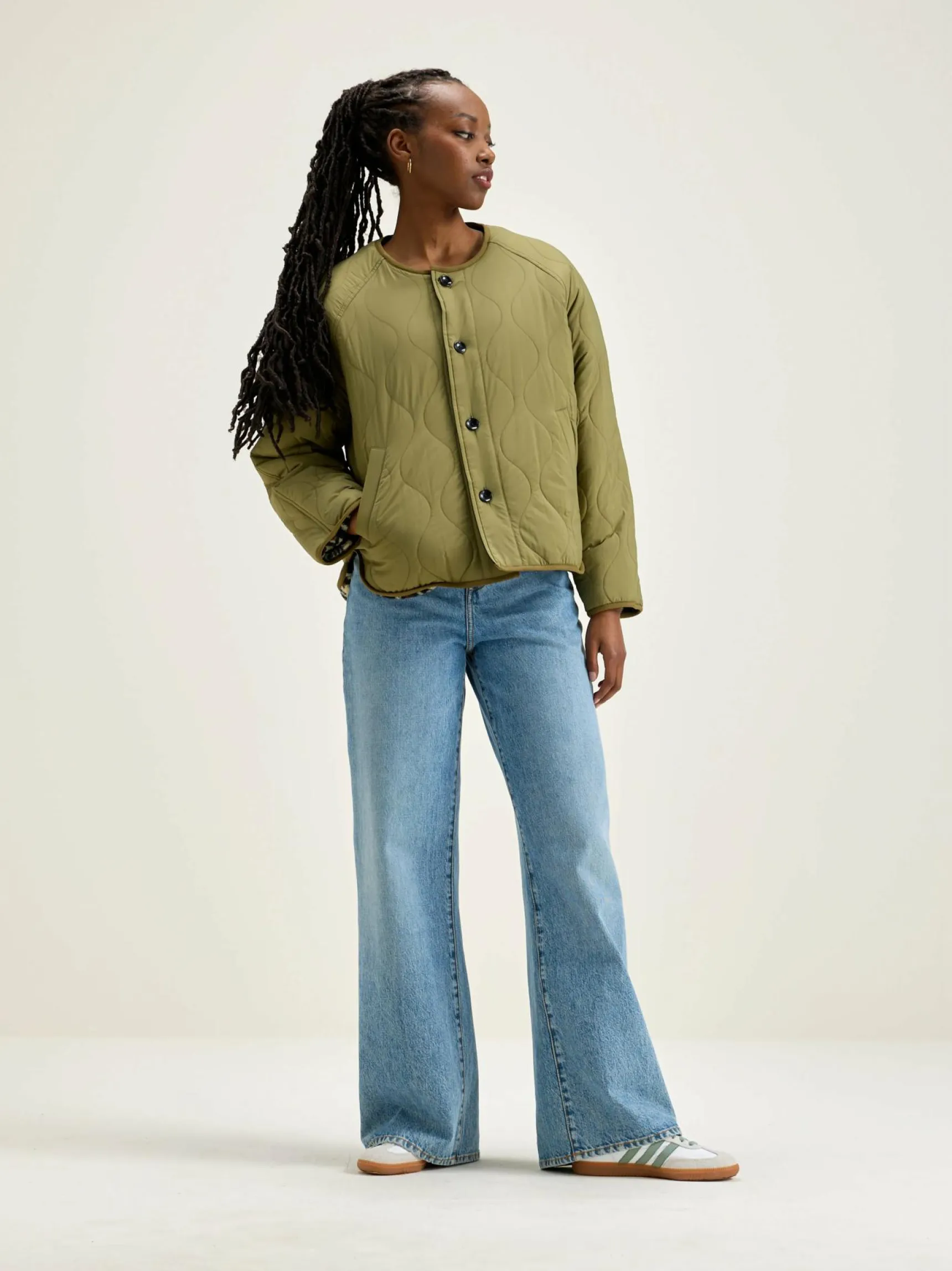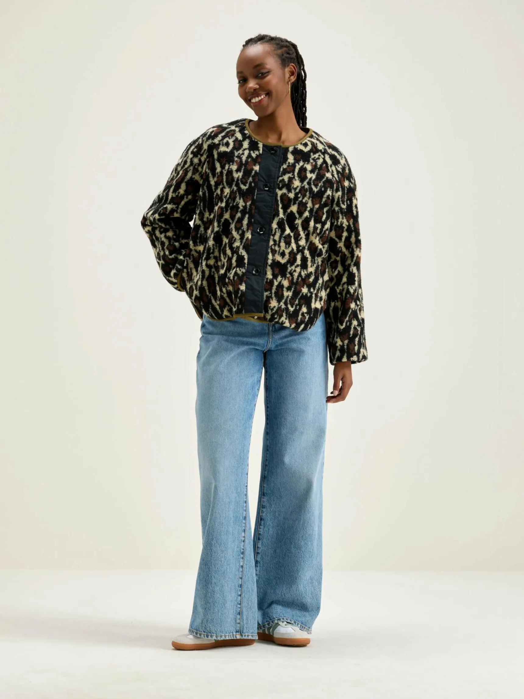 Omkeerbare oversizede jas met raglanmouwen. Een kant is van kaki ripstop stof en de andere is fleecestof met een luipaardprint.