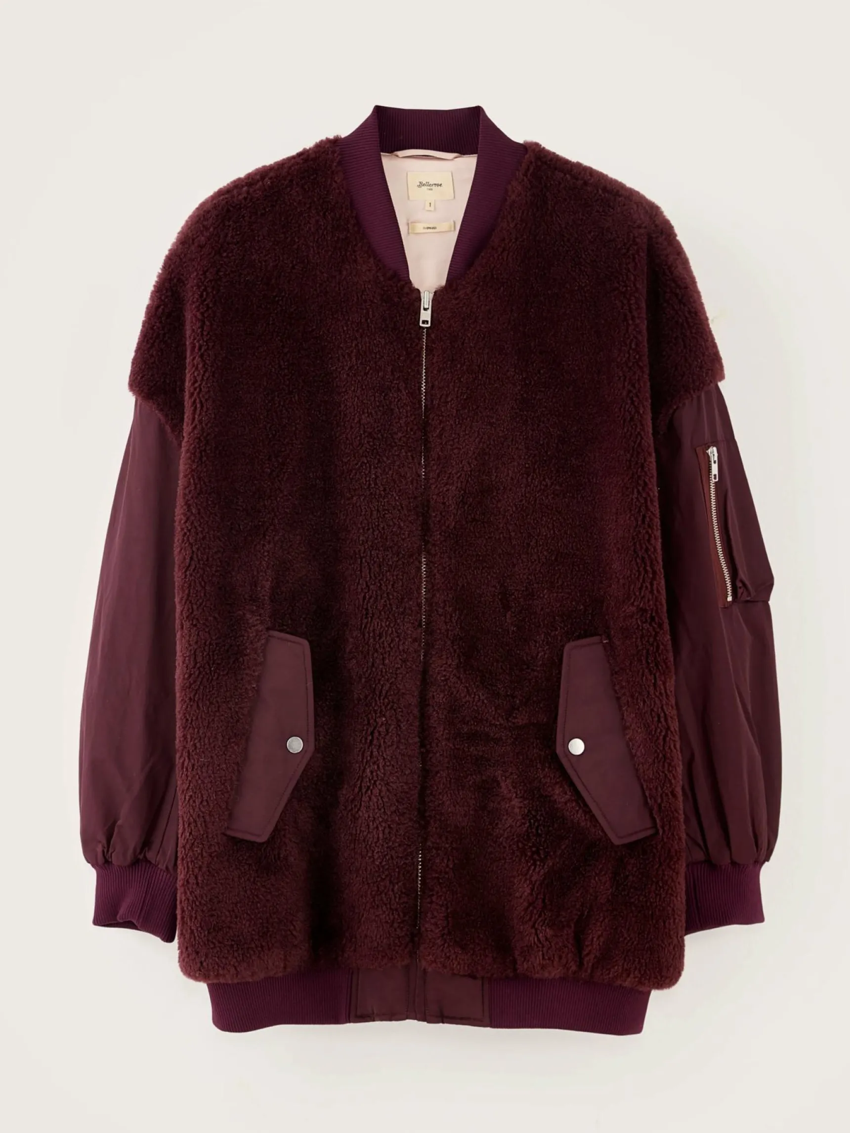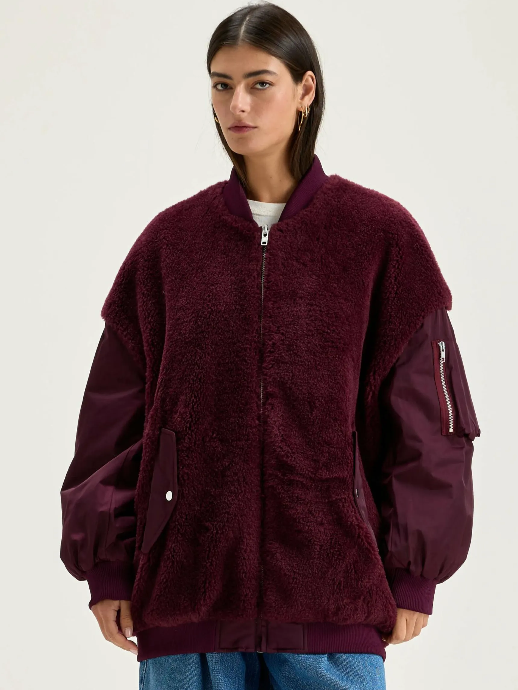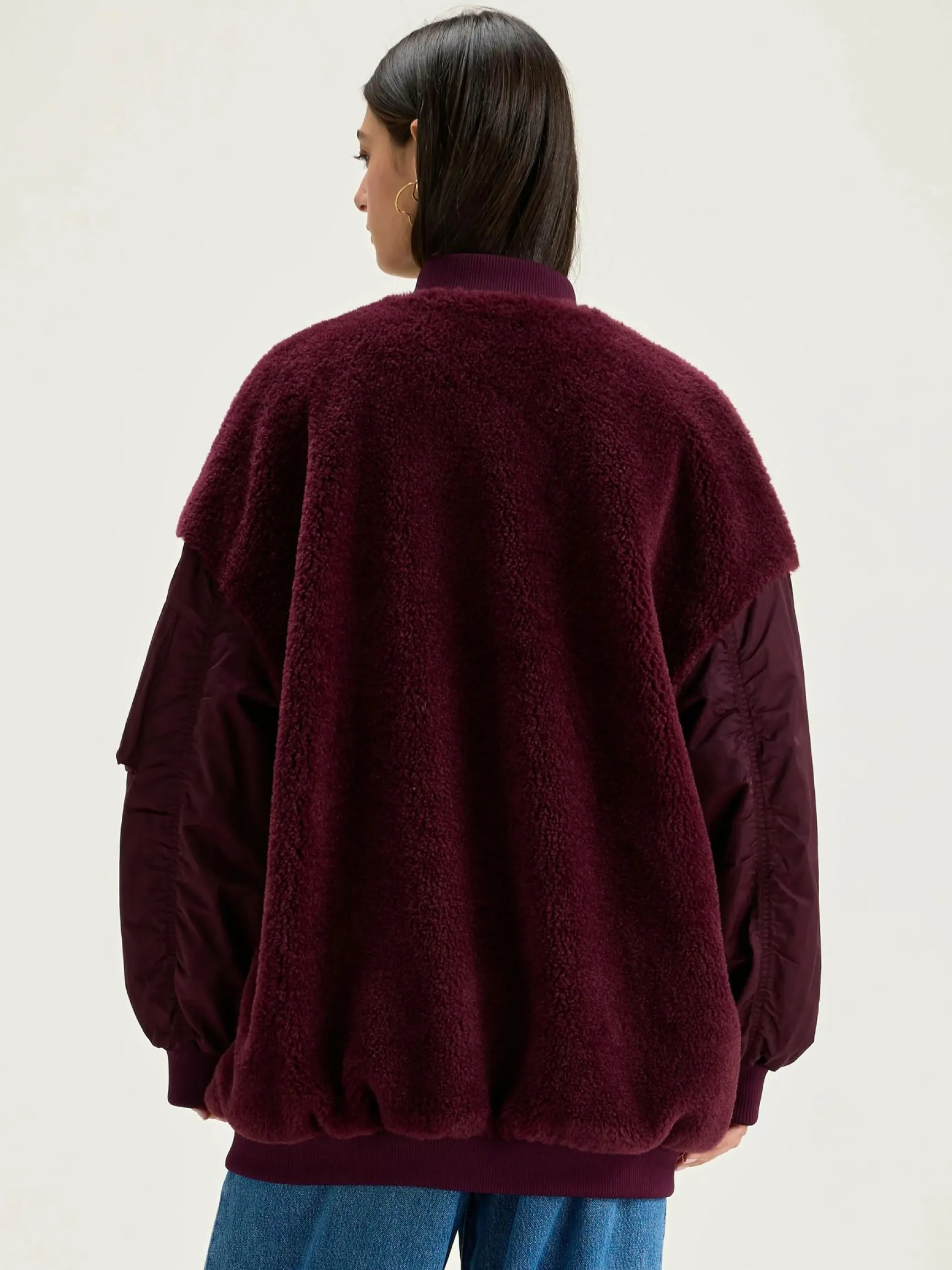 Oversizede, bordeaux bomberjas met een body van nepbont, klepzakken en geribde randen.