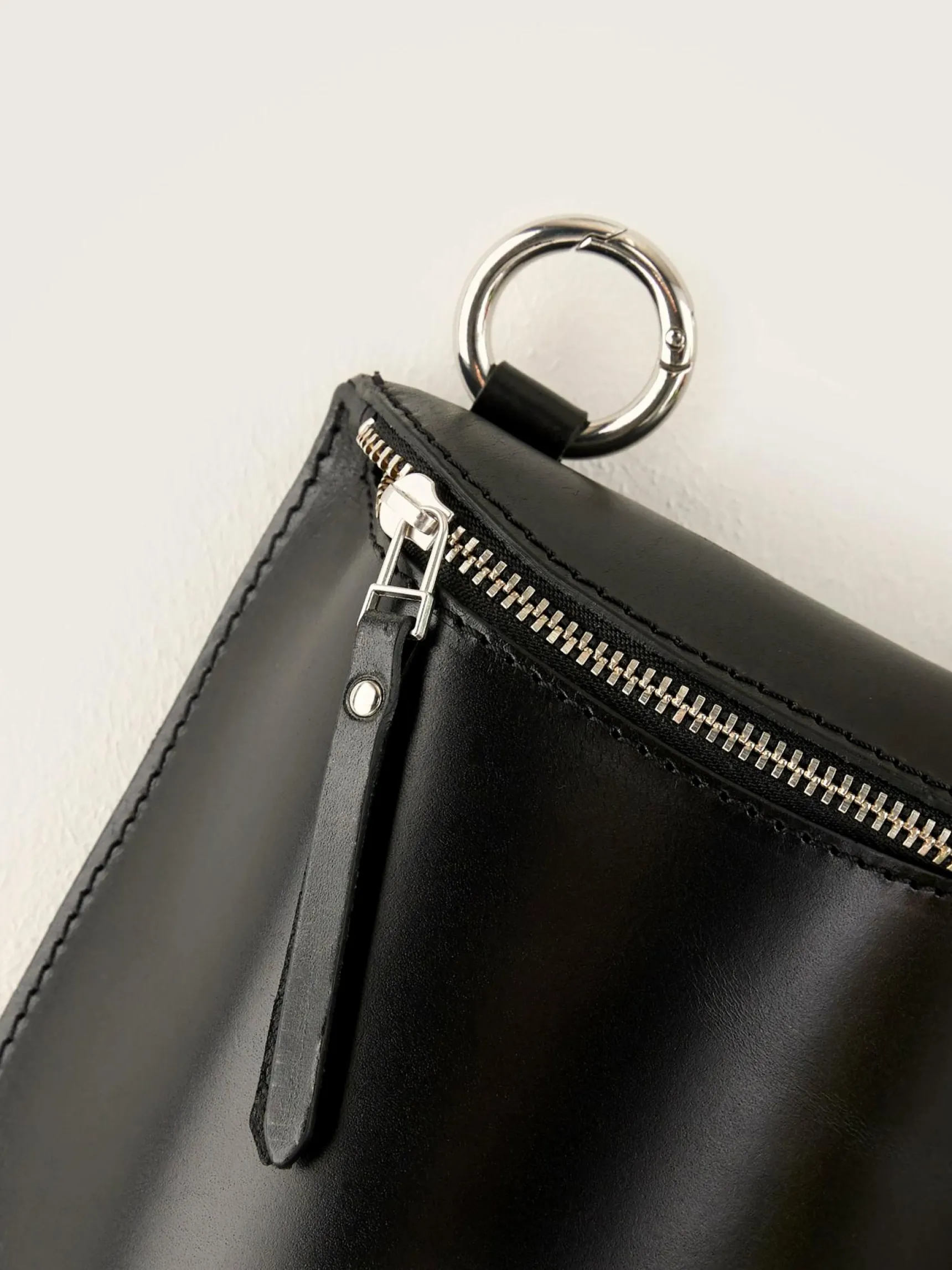 Mini tas met ritssluiting in glad zwart leer met een kenmerkende dubbel gestikte riem.