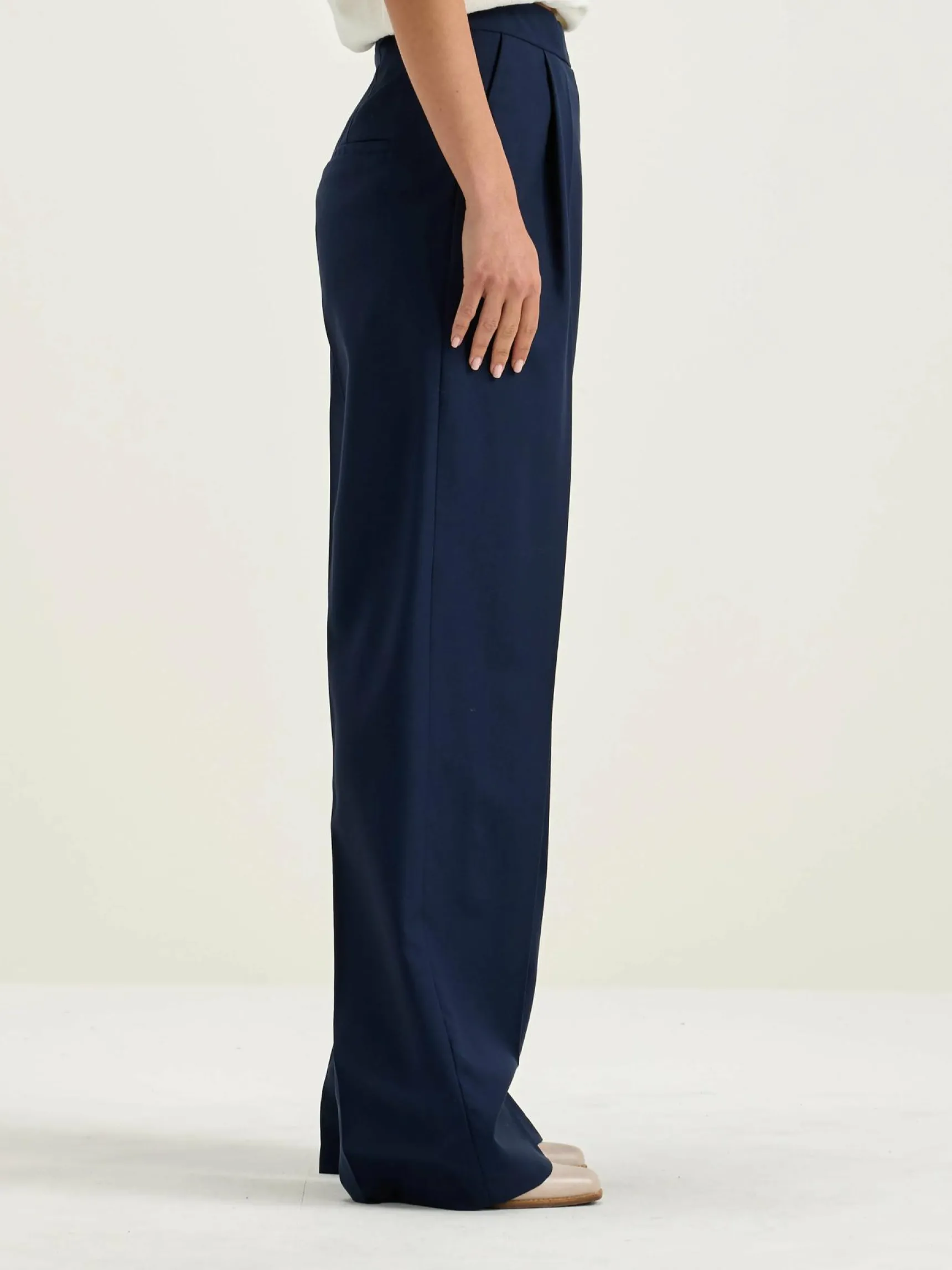 Elegante, high-waist broek van marineblauwe wol, met rechte pijpen en gedrapeerd gekruist voorpand.