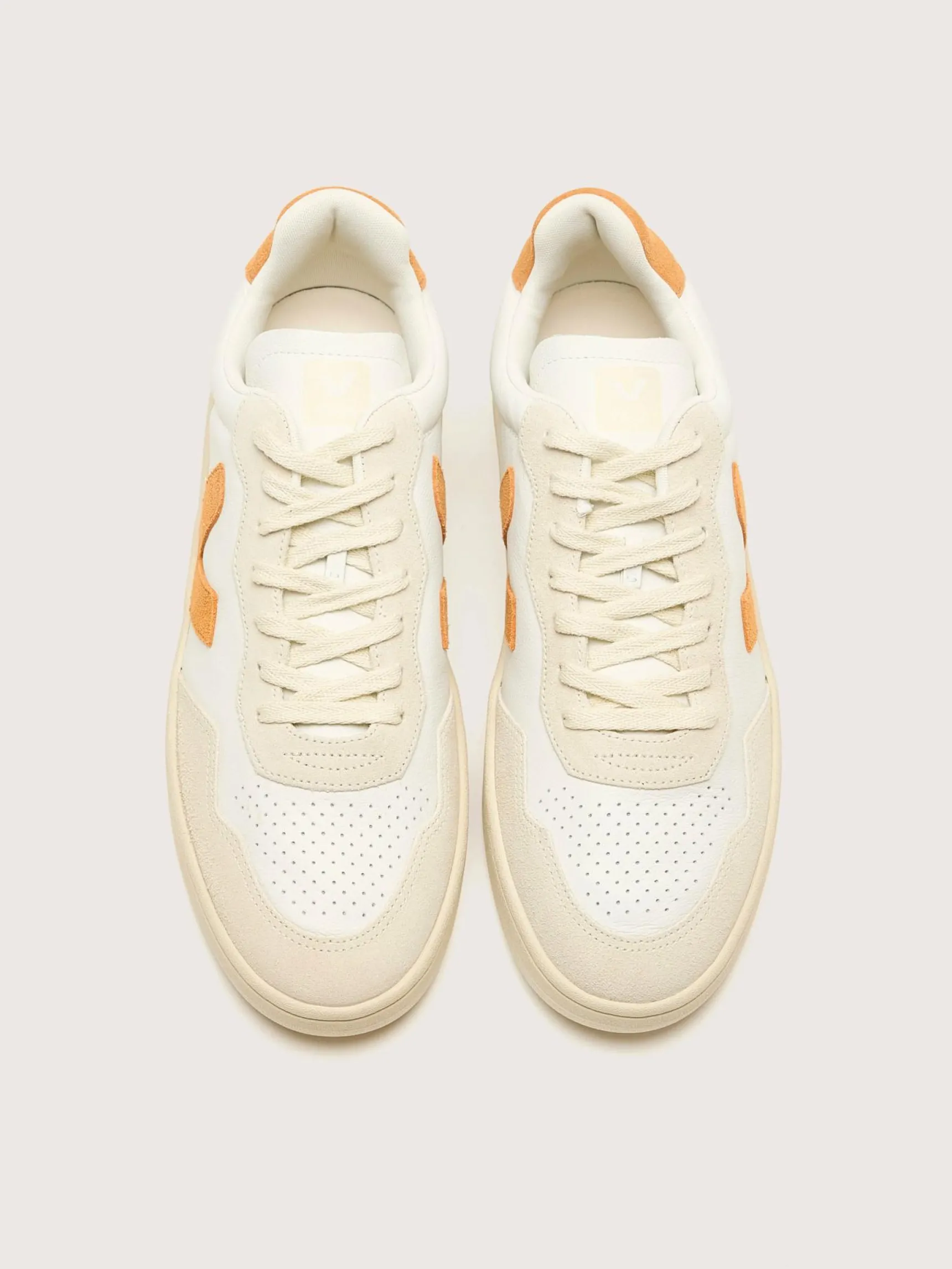 De Veja V-90 sneakers hebben een bovenwerk van Organic Traiced leder met iconische rubberen zolen uit Amazonië en milieuvriendelijke ontwerpelementen.