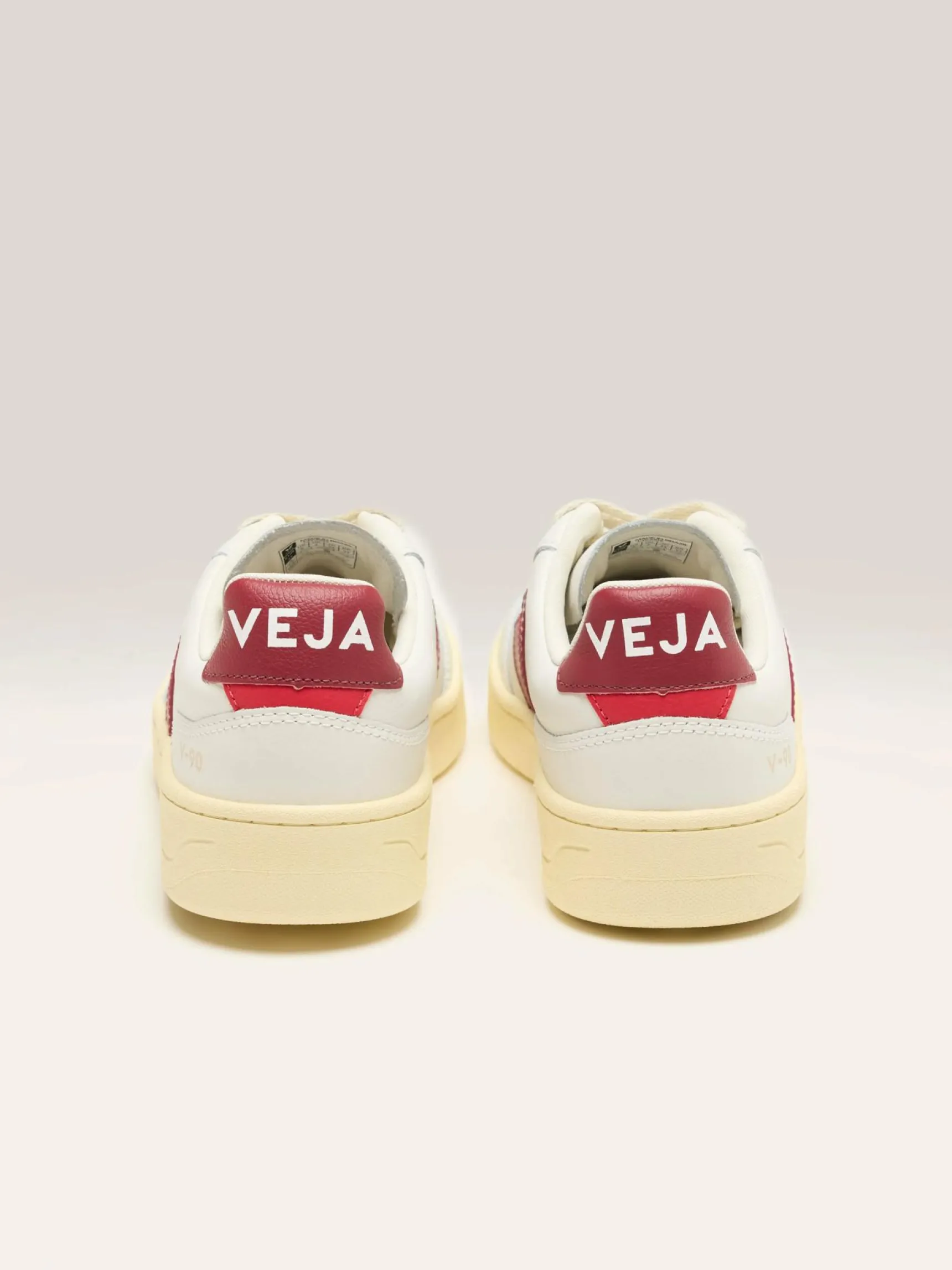 The Veja V-90 sneakers feature Organic Traced leather uppers with iconic Amazonian rubber outsoles and eco-friendly design elements.