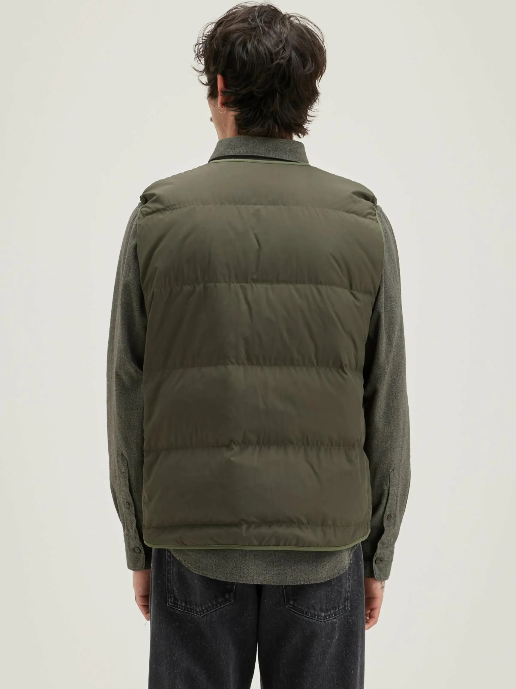 Omkeerbare bodywarmer met rits in donker olijfkleurig gewatteerd polyester.